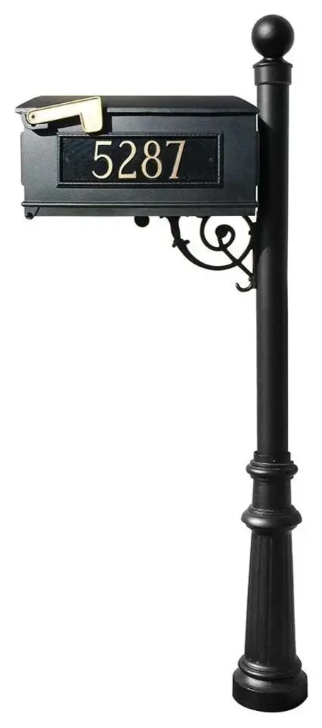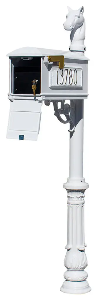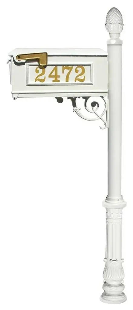 Lewiston Mailbox post system with ornate base, pineapple finial and 3 cast aluminum personalized address plates, WhiteOur Lewiston Mailbox Collection is made of rust-free cast aluminum with a durable weather resistant finish and comes with mailbox, post, support brace, decorative pineapple finial and ornate base. Mailbox has three cast aluminum address plates that mount to each side and front of mailbox. Mailbox color is white with white address plate (With gold numbers). Two different cast aluminum front plates are available: An address front plate or a decorative Fleur De Lis front plate.Cast aluminum white powder coated mailboxDecorative ornate basePineapple finial mounts to top of postAdds an elegant look to your homeProduct Dimension (WxDxH) inch: 8" x 20" x 5'' 2"Color: White