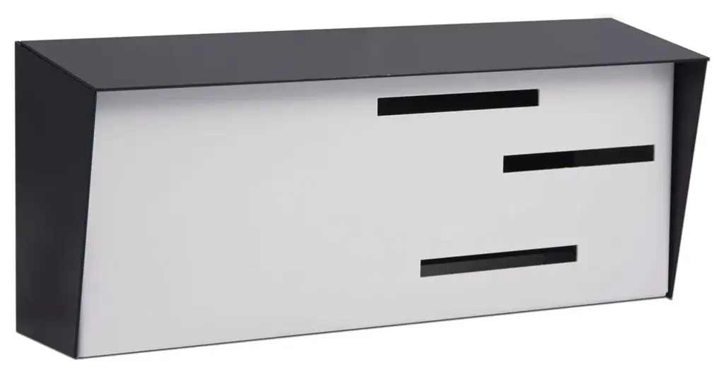 Modern Mailbox inspired by Mid-Century Modern design. Perfect for your Mid-Century Modern or Atomic Ranch home. Original design featuring clean modern lines and hidden hardware. Handmade in America using durable aluminum, finished with Mid-Century Modern two-tone powder coating. Wall mounted for easy installation. Top opening lid. 14.25" long x 4" deep x 6" tall.