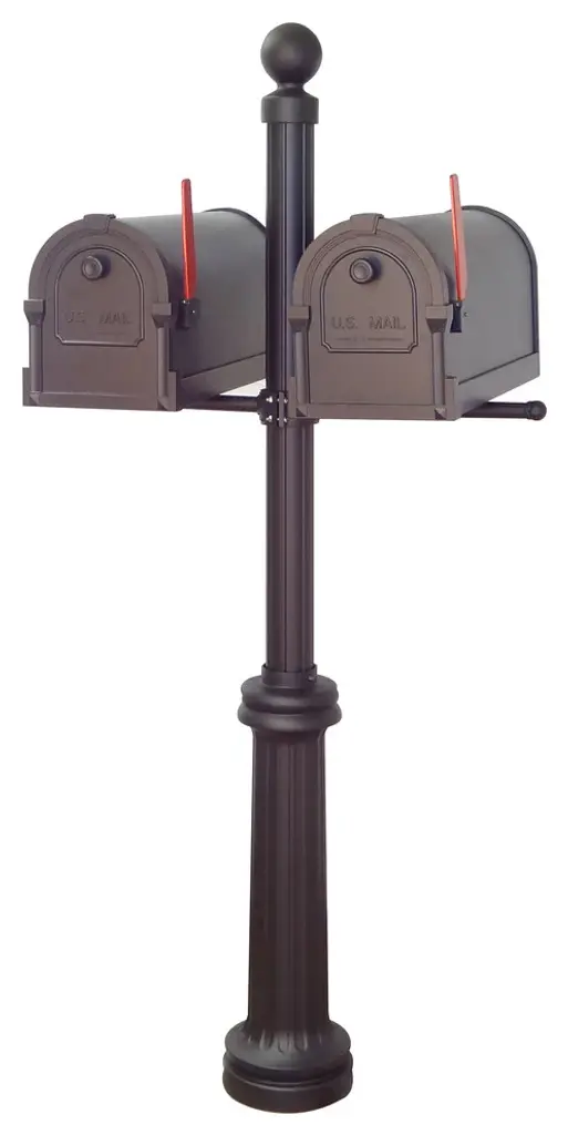 Combining quality and economy the Savannah curbside mailbox features a deeply cut, ornate cast aluminum door on a rolled aluminum body for maximum rust resistance. The Savannah''s spring loaded roller door catch and powder coated base will not peel or fade in the elements for a lifetime of maintenance free use.Two mailboxes are included with this combination.This Fresno Double Mount Direct Burial Mailbox Post is made of durable cast and extruded aluminum with a powder coated finish for a lifetime of beauty. 3" outer diameter x 76" H Fluted Post. Includes decorative mailbox double mounting bracket and cannon ball post topper and wrap around base.