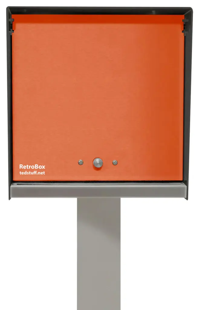 -The Retrobox is a Mid-century modern inspired mailbox, the perfect curb appeal for your home, office, condo or development. Made of quality materials, here in the USA. The Retrobox has a mail slot in the front for easy mail delivery and the doors open from the front and the back, so you can retrieve mail without stepping into the street. -The RetroBox is available with an Arctic White or Jet Black Outer Shell with 8 different door colors or Stainless Steel to choose from.-Each Retrobox body is made out .125"? 5052-H32 aluminum, powder coated with marine grade paint and custom anodized doors and number backings. The base is made out of 18 gage #4 finish stainless steel. Each box has custom laser cut address numbers on the sides, with laser engraved street address on the front door. -The Locking Kit, locks the front and back door from unwanted opening only by you. Mail is easily deposited threw the mail slot. 4 keys are included, and all keys will open the front and back door.The mail Box is 10"? wide, 17"? deep and 10"?tall and will hold days if not weeks of mail,• • • Pole not included, see below• • • -The optional pole is made from brushed 14 gauge 3"? x 3"? extruded stainless steel tubing. Pole price is $185.00 SEE OTHER TedStuff Listings,Houzz product ID# 150426410SKU: MAILBOXPOLE-The optional Light Kit makes finding your address at night easy for visitors, delivery services, car services, etc., as well as makes a statement in your neighborhood. By illuminating the side numbers at night with low voltage LED lighting that needs to be connected by you, to your low voltage landscape lighting. The requirements you must have to connect to, is a low voltage transformer of 12 watts The lighting kit will be installed and prewired for easy installation.Additional light kit price is $145.00SEE OTHER TedStuff Listings,Houzz product ID# 152437951SKU: MAILBOXLIGHTShips in 3 to 4 weeksIIMPORTANT, PLEASE REACH OUT TO THE SELLER WITH THE ADDRESS YOU WANT LASER ENGRAVED AND CUT IN THE SIDES OF YTHE BOX WHEN CHECKING OUT.