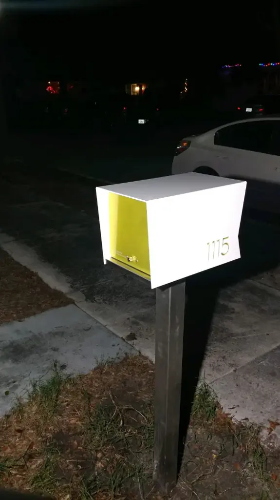 -The Retrobox is a Mid-century modern inspired mailbox, the perfect curb appeal for your home, office, condo or development. Made of quality materials, here in the USA. The Retrobox has a mail slot in the front for easy mail delivery and the doors open from the front and the back, so you can retrieve mail without stepping into the street. -The RetroBox is available with an Arctic White or Jet Black Outer Shell with 8 different door colors or Stainless Steel to choose from.-Each Retrobox body is made out .125"? 5052-H32 aluminum, powder coated with marine grade paint and custom anodized doors and number backings. The base is made out of 18 gage #4 finish stainless steel. Each box has custom laser cut address numbers on the sides, with laser engraved street address on the front door. -The Locking Kit, locks the front and back door from unwanted opening only by you. Mail is easily deposited threw the mail slot. 4 keys are included, and all keys will open the front and back door.The mail Box is 10"? wide, 17"? deep and 10"?tall and will hold days if not weeks of mail,• • • • • • POLE NOT INCLUDED, SEE OPTIONAL INFORMATION BELOW• • • • • • • • -The optional pole is 3"? x 3"?, heavy duty extruded tubing. Pole price is $165.00 for a powder coated aluminum post available in white, black or coconut. The Stainless steel pole is listed at $249.00.SEE OTHER TedStuff Listings,Houzz product ID# 150426410SKU: MAILBOXPOLE-The optional Light Kit makes finding your address at night easy for visitors, delivery services, car services, etc., as well as makes a statement in your neighborhood. By illuminating the side numbers at night with low voltage LED lighting that needs to be connected by you, to your low voltage landscape lighting. The requirements you must have to connect to, is a low voltage transformer of 12 watts The lighting kit will be installed and prewired for easy installation.Additional light kit price is $155.00SEE OTHER TedStuff Listings,Houzz product ID# 152437951SKU: MAILBOXLIGHTShips in 3 to 4 weeksIMPORTANT, PLEASE REACH OUT TO THE SELLER WITH THE ADDRESS YOU WANT LASER ENGRAVED AND CUT IN THE SIDES OF YTHE BOX WHEN CHECKING OUT.