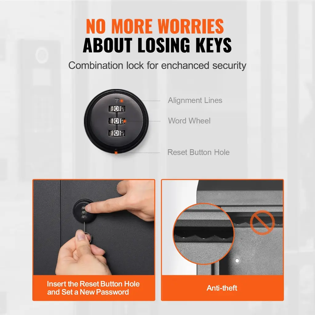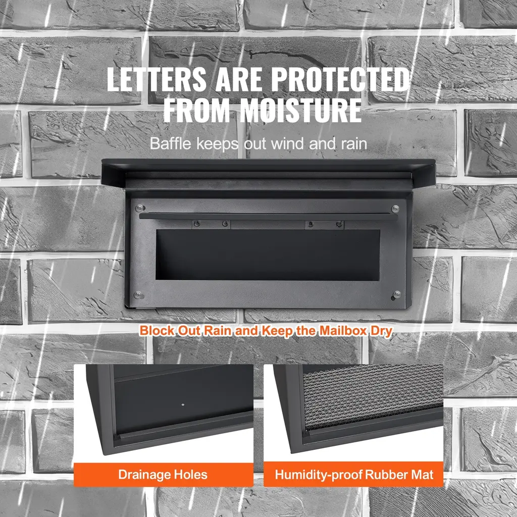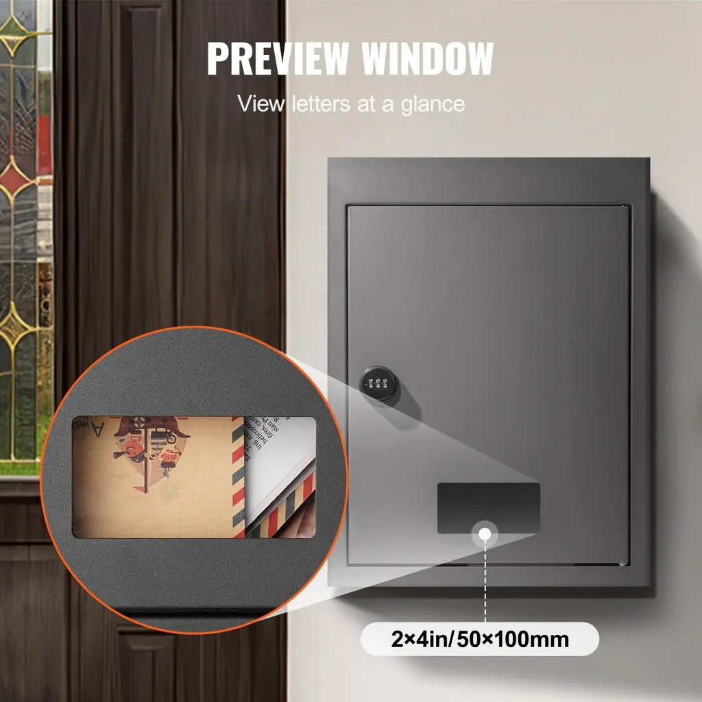 Rainproof Design: Our through the wall / door key drop box features a secure rainproof design with a large flap / shield positioned in front of the delivery slot, ensuring the safety of important mail even during heavy rain. The bottom of the box is equipped with rubber pads and drainage holes to quickly remove any accumulated water, preventing mail from getting damp. Large Storage Box & Slot: For 13x7x17" option: The through the wall drop box includes a 13 x 7 x 17 inch storage box, providing 0.88 cubic feet of space, capable of accommodating various sizes of items. The 9.5 x 1 inch (240 x 26 mm) slot is suitable for smartphones, envelopes, and small parcels. For 12.5x6.3x16.9" option: The through the wall drop box includes a 12.5×6.3×16.9 inch storage box, providing a space of 0.74 cubic feet, capable of accommodating various items. The 1.6×9.8 inch (40×250mm) slot is suitable for smartphones, envelopes, and small packages. For 12x6x16" option: The through the door drop box includes an 12×6×16 inch storage box, providing 0.51 cubic feet of space, capable of accommodating various sizes of items. The 9.8×1.8 inch large slot is suitable for smartphones, envelopes, small parcels, and keys. For 12 x 6.1 x 14.1 inch option: The through the door drop box includes a 12 x 6.1 x 14.1 inch storage box, providing 0.59 cubic feet of space, capable of accommodating various sizes of items. The 1.9 x 10.2 inch (48 x 258 mm) slot is suitable for smartphones, envelopes, and small parcels. Durable Materials: Constructed from heavy-duty steel and coated with a rust-resistant powder, our through the wall mail box is sturdy and durable. Its scratch-resistant surface design maintains an attractive appearance and enhances longevity. This mailbox ensures long-term wall security and usage life, providing peace of mind for your daily life. For 12.5x6.3x16.9" and 12 x 6.1 x 14.1 inch option: Equipped with a spacious visual window measuring 2×4 inch (50×100mm), allowing for easy viewing of mail without the need to open the box, providing you with instant access to your mail status. Combination Lock for Security: The use of a combination lock is more convenient, eliminating the hassle of losing keys, and allows for password changes at any time. Inside the mailbox, there are metal baffles to prevent theft or fishing for important mail. It's ideal for use at home, offices, workplaces, or schools. For 12x6x16" option: The key lock protects your mail privacy, coming with 2 keys for convenient access by you and your family. Easy Installation: For Wall Mailbox option: Our through the wall locking key drop box is equipped with adjustable slides, suitable for walls with a thickness of 2.8-7.9 inch (70-200 mm), compatible with various common wall types. For Door Mailbox option: Our through the door locking key drop box is designed for doors with a thickness of 1.7 inch/43mm and is compatible with various common door types. The wall-mounted mailbox is easy to install with detailed installation instructions, making it suitable even for beginners. Wall Mailbox option Package Content 1×Instruction Manual; 1×Box; 1×Inner Delivery Port; 1×Outer Delivery Port; 1×Silicone Mesh Mat; 4×Small Self-tapping Wire+4×Small Plastic Expansion Tube; 4×M4 Screws; 4×Large Self-tapping Wire+4×Large Plastic Expansion Tube Door Mailbox option Package Content 1×Instruction Manual; 1×Box; 1×Rainproof Plate; 1 × Inner Decorative Plate; 1×Silicone Mesh Mat; 12×Self-tapping Wire; 4×Machine Thread Bolts (with Spacers, Nuts); 2×Key (only for 12x6x16" option)