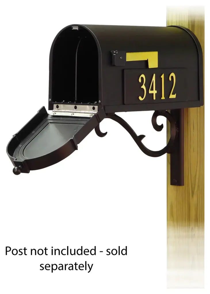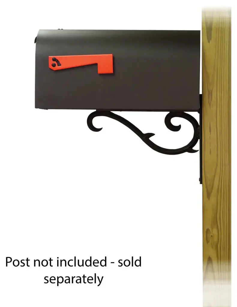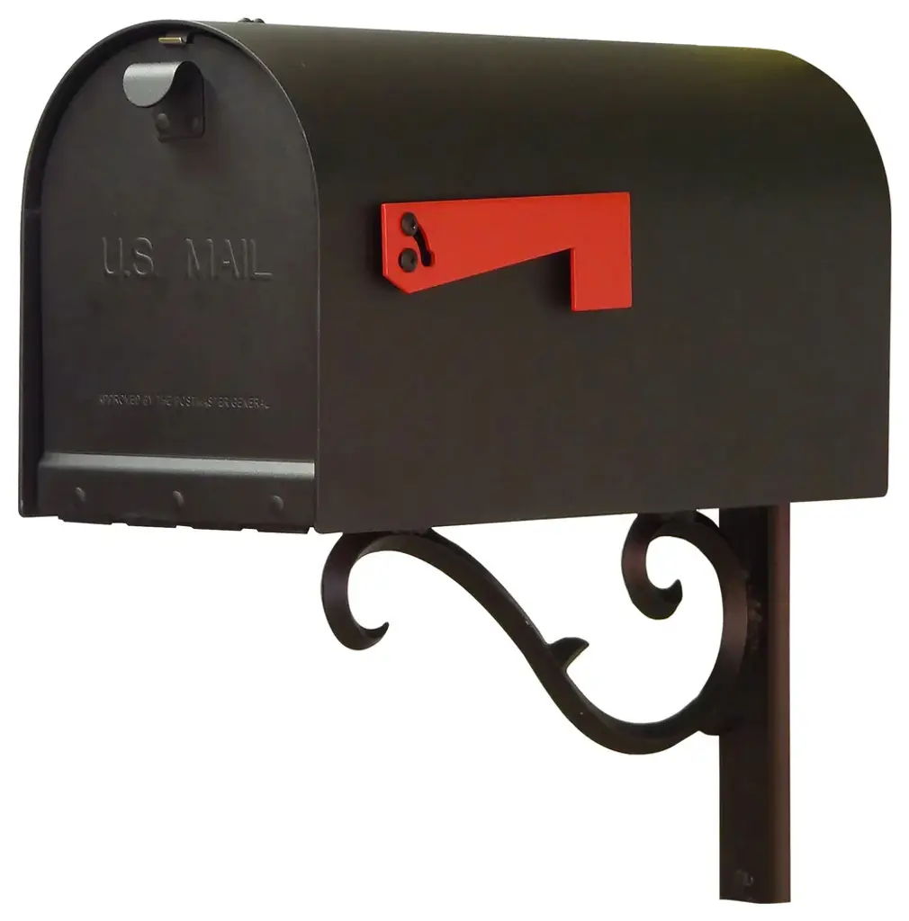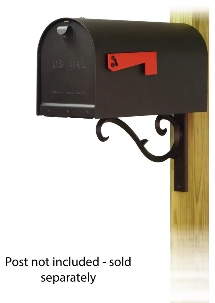 The Titan Steel Mailbox and Sorrento mounting bracket combination presents a decorative option for the typical wood post curbside mailbox. Tired of replacing your mailbox every couple of months because it is a target for baseball bats, rocks, and M-80''s. Then you need the Titan Steel Mailbox.Virtually Indestructible3/32 (10 gauge) thick wallsFade resistant, powder coated finishStainless Steel hinge and hardwareHeavy, metal flag with stainless steel fastenersU.S. Post Master approvedThe Sorrento mounting bracket is an elegant cast aluminum scroll that will give a high class, decorative appearance to your mailbox. Mailbox and mailbox mounting bracket included. This set does NOT include a post as it is intended to be mounted on an existing wood post or solid surface, or a new wood post that can be purchased separately. Mounting hardware is included.