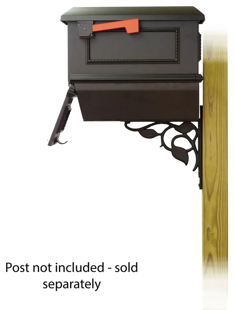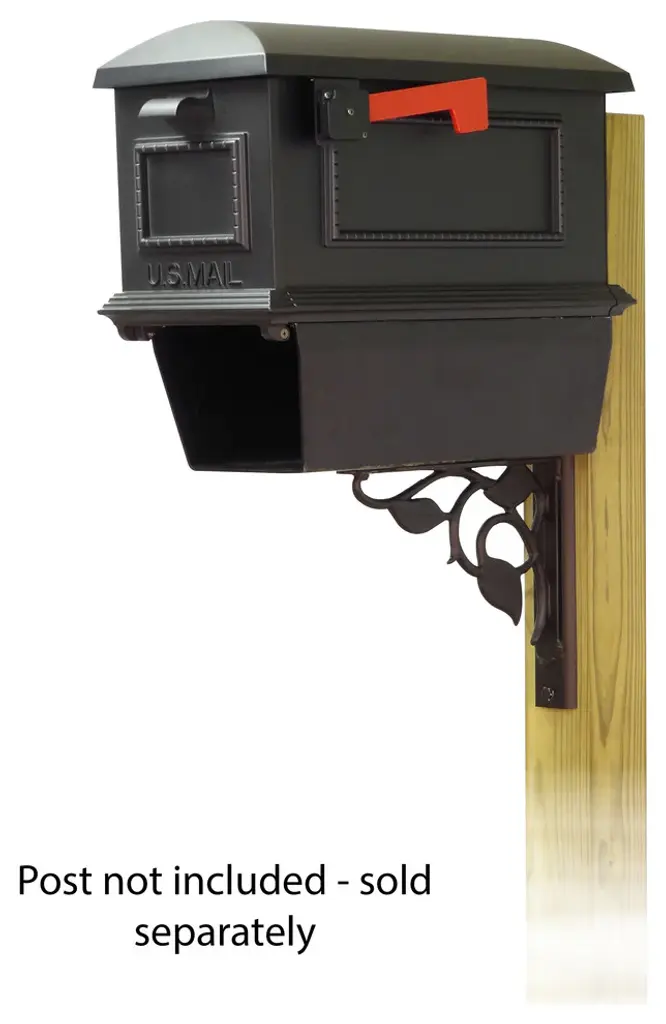 The Traditional Mailbox and Floral mounting bracket combination presents a upscale option for the typical wood post curbside mailbox. The Traditional Curbside Mailbox has universal appeal with it''s smooth geometric style, accented with a simple decorative braid. The low profile belies the spacious interior. No mounting plate is required. The Floral mounting bracket is a decorative cast aluminum bracket that will bring an elegant appearance to your mailbox. Newspaper tube, mailbox and mailbox mounting bracket included. This set does NOT include a post as it is intended to be mounted on an existing wood post or solid surface, or a new wood post that can be purchased separately. Mounting hardware is included.