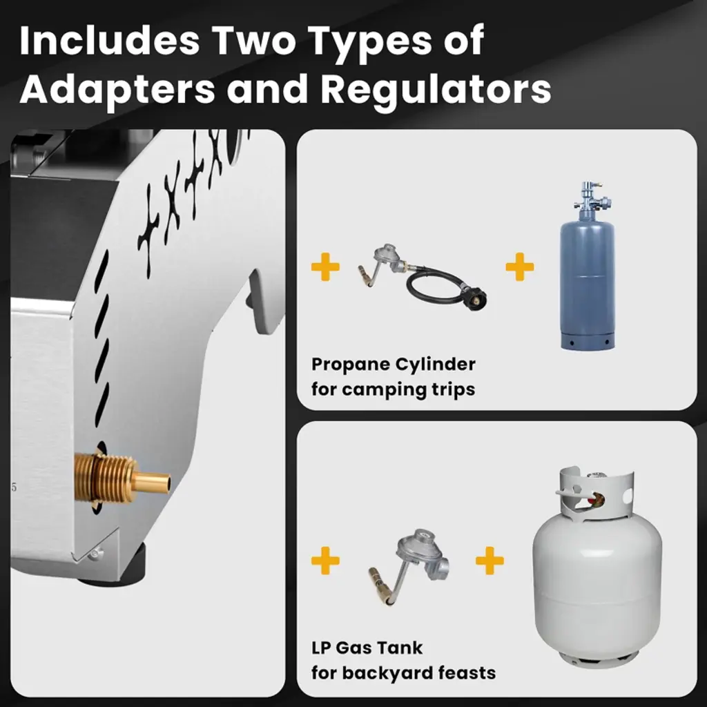 Double the Firepower – 16,000 BTU Total Output with dual food-grade SUS304 stainless steel burners ensures intense, even heat for searing steaks, grilling burgers, or cooking family meals in minutes. Designed for versatility, it offers 309 sq. in. of Grilling Freedom in a Compact Body—enough space to grill 12 burgers simultaneously—while maintaining a sleek, space-saving profile ideal for patios or picnic tables. Built to last, its full stainless steel construction resists rust and weather, complemented by a removable oil drip box and smooth surfaces for effortless cleanup. The instant ignition system lets you start grilling with a button push (plus a backup match holder), and its portable power—lightweight, LPG/small-canister compatible, and equipped with cast iron grates—makes it perfect for camping, RV trips, or backyard feasts.