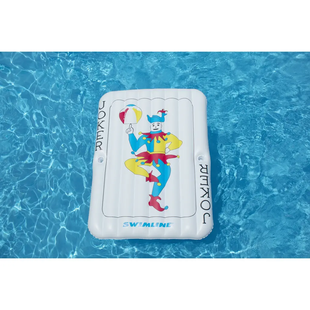 You will always be a winner while relaxing on this joker playing card designed pool mattress. Mattress style lounger makes this the perfect float for tanning while enjoying the gentle rocking of the waves. Have some beautiful conversations with your friend by relaxing in this pool mattress. Features: Large inflatable swimming pool raft White blue yellow red and black colored There is a Joker from a deck of cards twirling a pool ball Features dual drink holders and a tube design in the center Inflatable reads "JOKER" "Swimline" For ages 13 years and up Raft is made out of heavy-duty vinyl This is not a lifesaving device - always keep children in sight within quick and easy reach when they are in the water with you Dimensions: 49" wide x 69" long Material(s): vinyl Note: Ships flat - does not come inflated