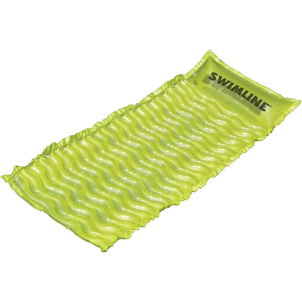 Experience ultimate relaxation and comfort with our inflatable swimming pool air mattress. This luxurious float is perfect for lounging in the pool soaking up the sun and enjoying the water. The vibrant lime green color and eye-catching bubble swirl design make it a stylish addition to any pool party or summer gathering. The built-in pillow offers added comfort for your head and neck while the durable vinyl construction ensures long-lasting use. With easy inflation and deflation this float is a must-have for any pool enthusiast looking to enhance their pool experience. Get ready to kick back relax and float away on this comfortable and stylish pool accessory! Product Features: Insta-mat inflatable swimming pool air mattress float Features a bubble-swirled pattern on the entire float Full width built in pillow reads "Swimline" Quick to inflate and deflate Roll it up and take it along Heavy-duty vinyl construction To use on pools beaches or lakes Recommended for ages 13 years and up Dimensions: 32" wide x 72" long Material(s): vinyl