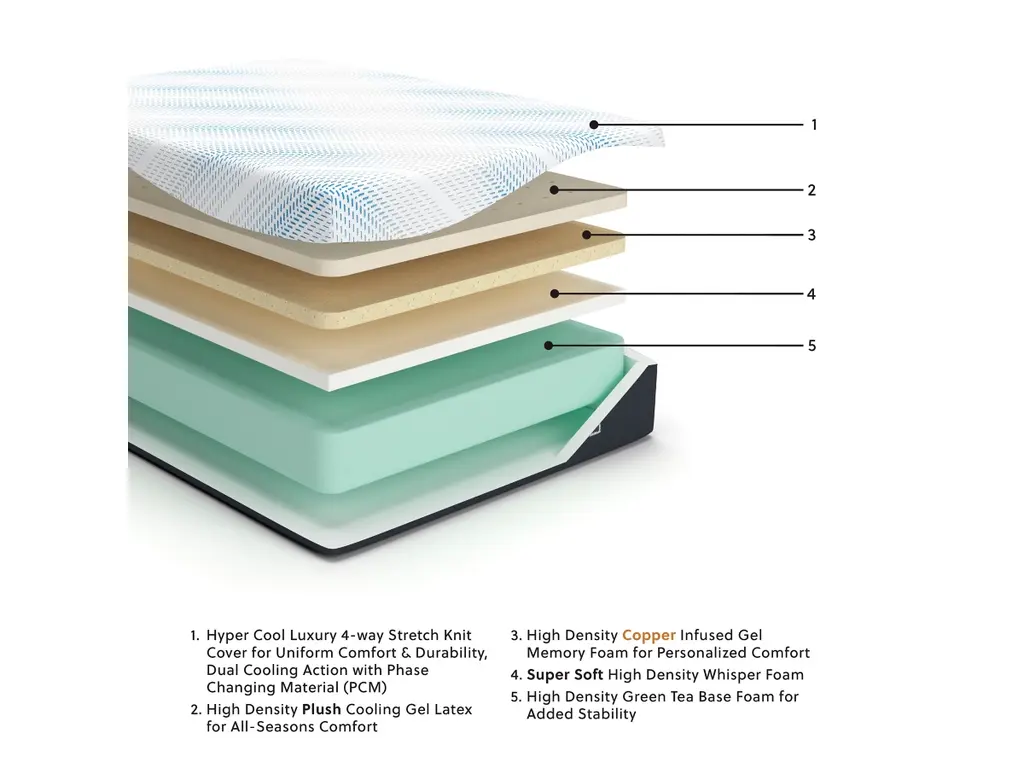 Discover the luxury of this California king gel memory foam mattress. A layer of cooling gel latex and two layers of temperature-regulating material keep you at a comfortable temperature all night long. Copper-infused memory foam contributes to the cooling performance and a green tea-infused support foam base keeps your mattress fresh. Contouring comfort foam conforms to your body, delivering amazing support, pressure relief and comfort.