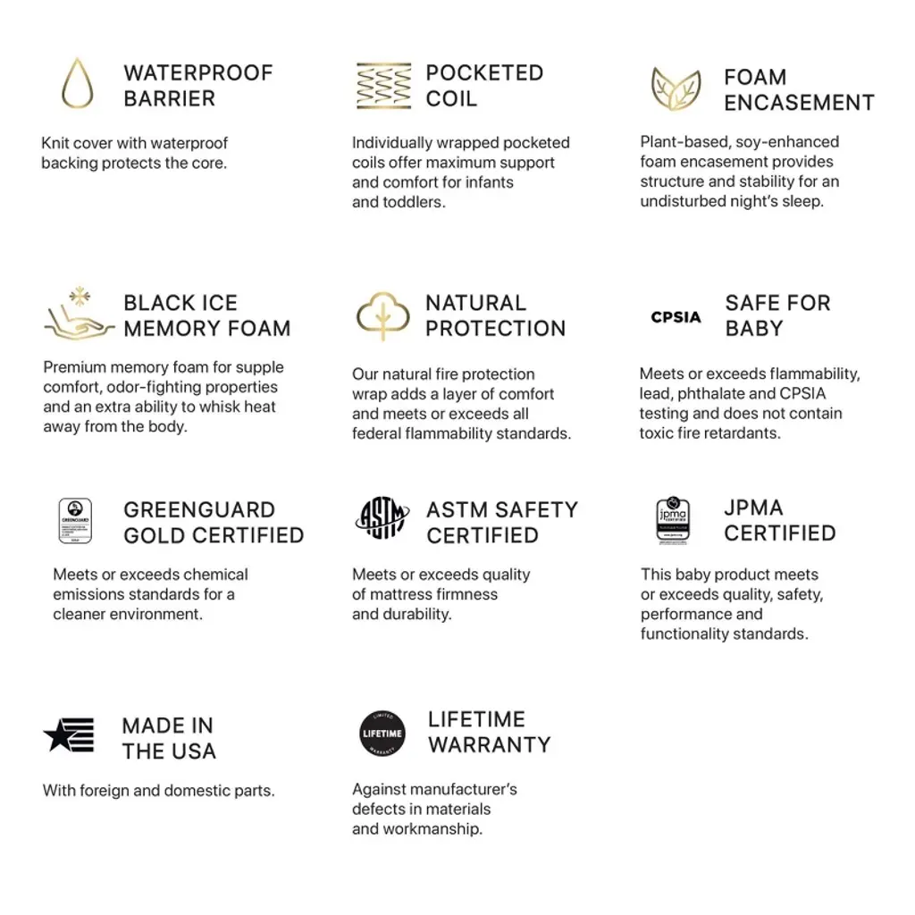 Your child will experience a more restful, undisturbed sleep with the Beautyrest Black BlackICE Crib and Toddler Mattress from Simmons Kids. Designed to achieve a sleep that’s completely restorative, this Beatuyrest Black baby mattress marries technology and luxury. At the core of the mattress Advanced Pocketed Coil Technology delivers pressure relief and support, while a layer of BlackICE Memory Foam on the toddler side helps manage your little one’s temperature as they sleep. The BlackICE features an innovative breathable gel that supports an ideal sleep climate, every night. Topped with a lavishly soft fabric cover, the Beautyrest Black BlackICE Crib and Toddler Mattress creates a safe and splendid sleep environment from birth through toddlerhood.