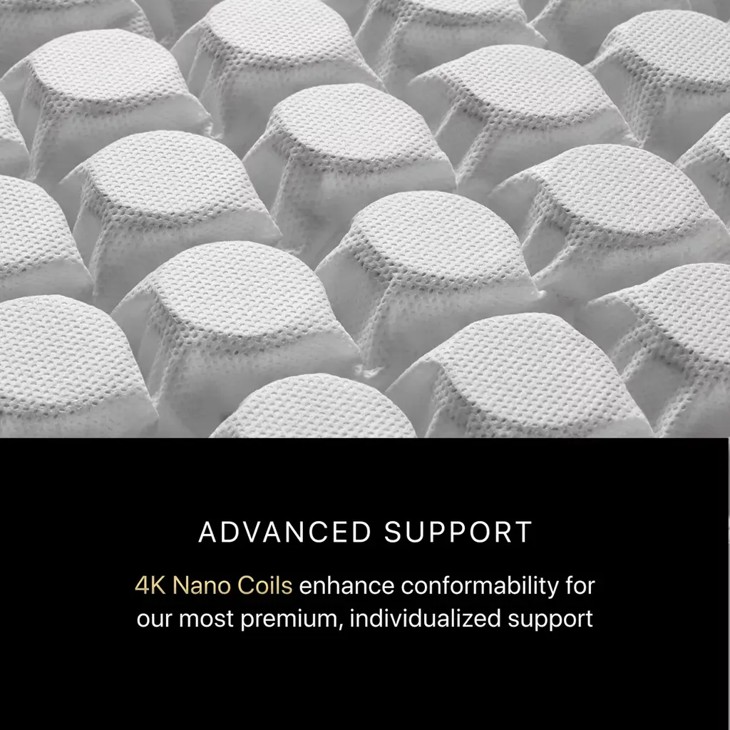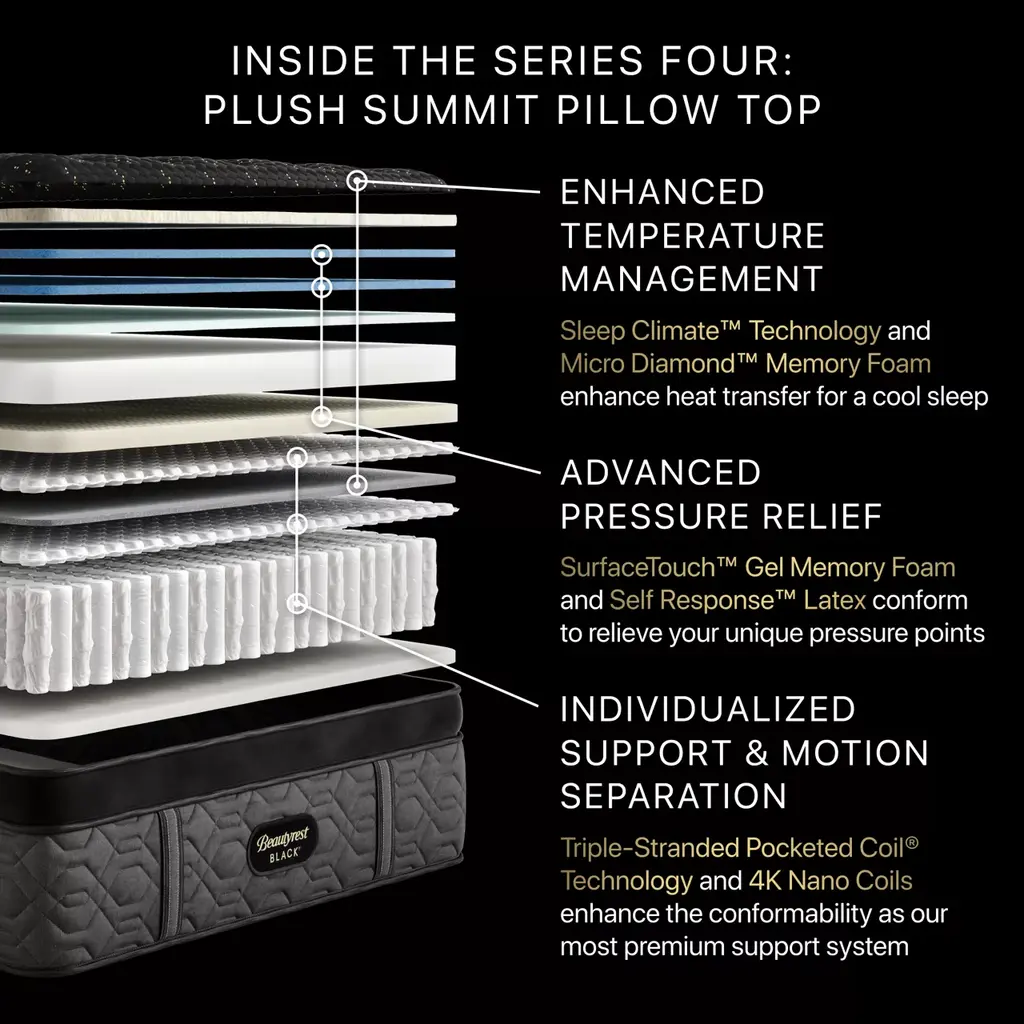 Experience the best of Beautyrest®, featuring advanced temperature management technology, Micro Diamond™ Memory Foam, Self-Response™ Latex, and advanced, Triple-Stranded Pocketed Coil® Technology for conforming support and motion separation. Two layers of 2K Nano Coils, for a total of 4K Nano Coils, offer a specialized upgrade as they conform to your body for enhanced, individualized support. With the inclusion of 4K Nano Coils plus additional layers of premium foams, the Series Four model is the most exclusive offering in the Beautyrest Black® Collection. With the inclusion of premier materials and advanced sleep technology, this Collection optimally aligns at the intersection of luxury and innovation for an extraordinarily comfortable sleep.