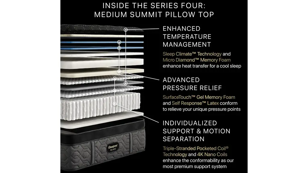 Experience the best of Beautyrest, featuring advanced temperature management technology, Micro Diamond Memory Foam, Self-Response Latex, and advanced, Triple-Stranded Pocketed Coil Technology for conforming support and motion separation. Two layers of 2K Nano Coils, for a total of 4K Nano Coils, offer a specialized upgrade as they conform to your body for enhanced, individualized support. With the inclusion of 4K Nano Coils plus additional layers of premium foams, the Series Four model is the most exclusive offering in the Beautyrest Black Collection. With the inclusion of premier materials and advanced sleep technology, this Collection optimally aligns at the intersection of luxury and innovation for an extraordinarily comfortable sleep.