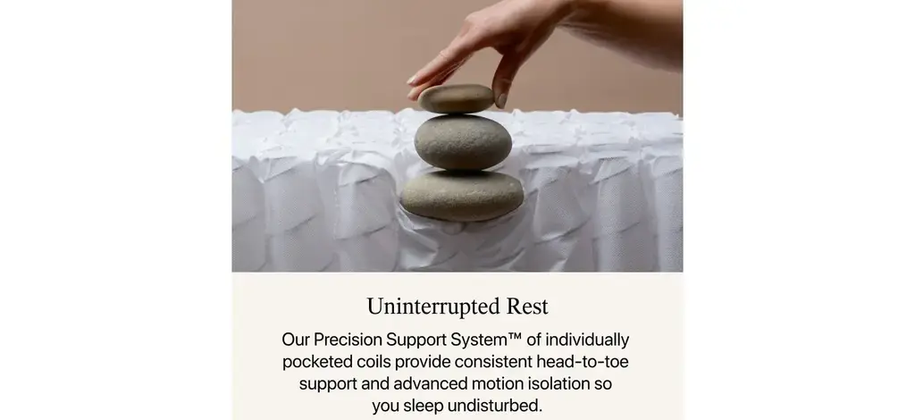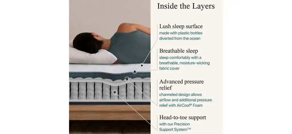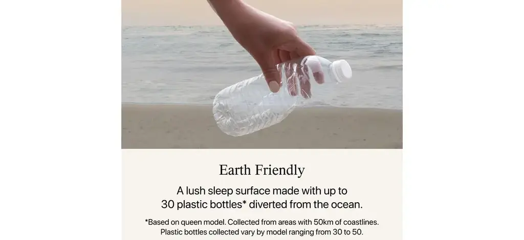 Experience support for more than just your body with the Harmony Collection. Innovative materials work harmoniously to bring you restorative sleep with improved support, advanced motion isolation, and a lush cover made from plastic bottles diverted from the ocean. The Precision Support System offers consistent support across the entire mattress, from head to toe, so you and your partner sleep undisturbed. Up to 50 plastic bottles collected by hand from coastlines and ocean-bound waterways* have been transformed into premium fabric to create a lush, durable sleep surface that helps contribute to cleaner water. A breathable, moisture-wicking fabric helps you sleep comfortably throughout the night. Pressure-relieving foams help ease aches and pains while also creating airflow throughout the mattress. Step-ups feature the additional cooling comfort of Infinicool and premium foams for enhanced pressure relief. All models are crafted with a lofty, quilted top, making them perfect for those who prefer a lifted feel and want rejuvenating sleep each and every night. *Collected from areas within 50km of coastlines. Plastic bottles collected vary by model ranging from 30 to 50.