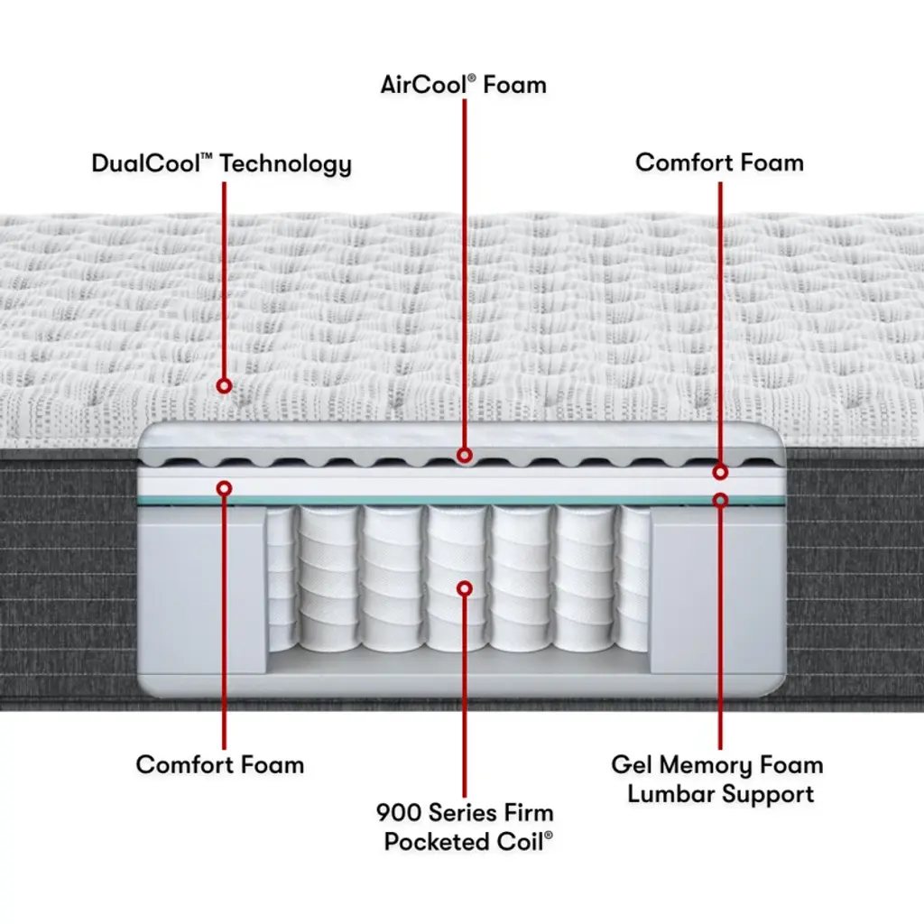 Sleep luxuriously with Beautyrest Silver BRS900 mattress. Featuring Beautyrest’s innovative 900 Series Pocketed Coil technology, the Silver BRS900 mattress provides superior support from its base up. Sleep distraction-free with this support layer, designed to isolate motion between partners, and stretch out comfortably with the BeautyEdge layer’s edge-to-edge support. The Gel Memory Foam Lumbar Support layer provides pressure-relief where you need it most, and the DualCool moisture-wicking technology ensures you wake feeling refreshed. The Silver BRS900 is crafted to optimally support your body for a comforting, cooling sleep. Its innovative features, paired with the mattress’s clean, modern design, package perfectly together for a luxury sleep experience, night after night