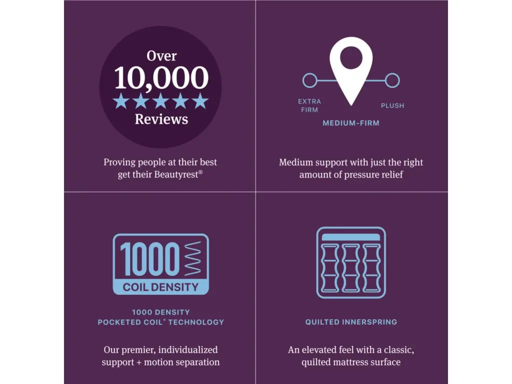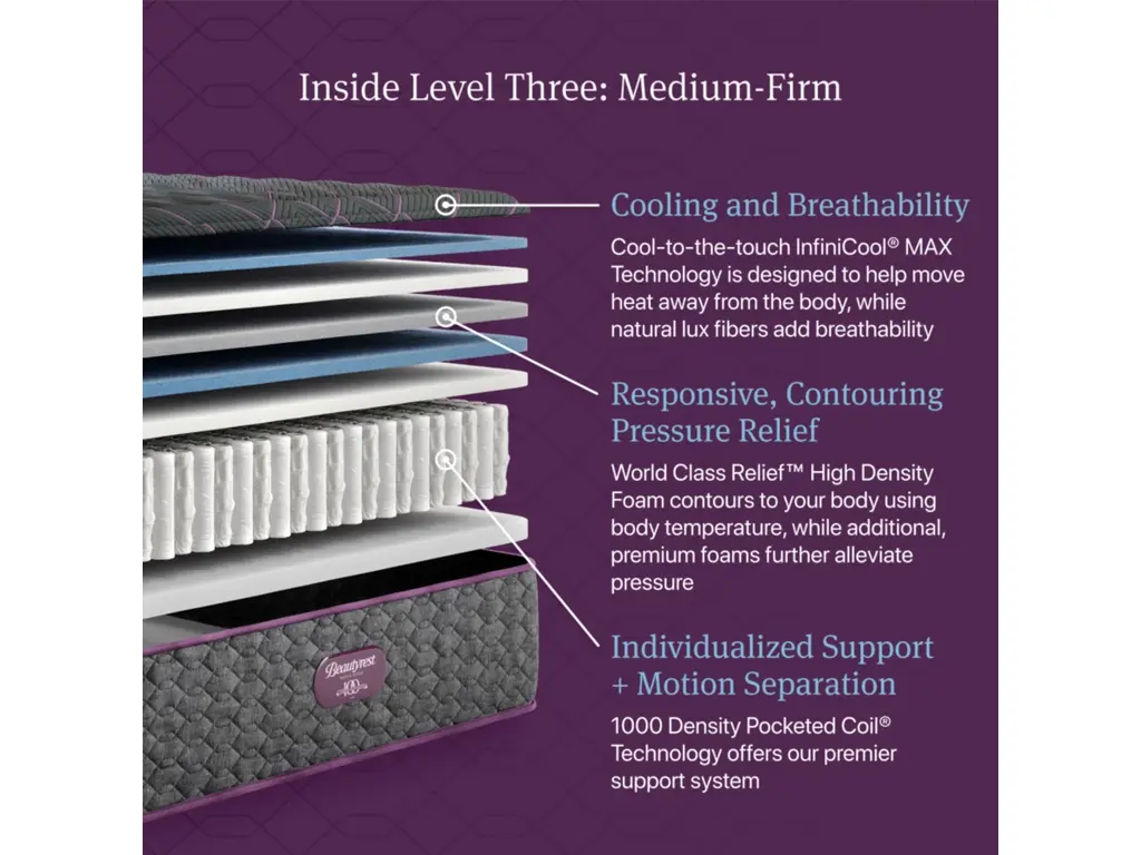 Step up to a world class sleep experience with Beautyrest® World Class™. Our 1000-density Pocketed Coil® Technology and higher density foams provide premier individualized support + motion separation. Our brand new World Class Relief™ HD Foam, featured in all Level Three Mattresses, offers remarkable pressure relief that responds to your body. InfiniCool® MAX Technology offers advanced cooling with vertical cooling fibers in our Beautyrest® World Class™ Quilted mattresses.