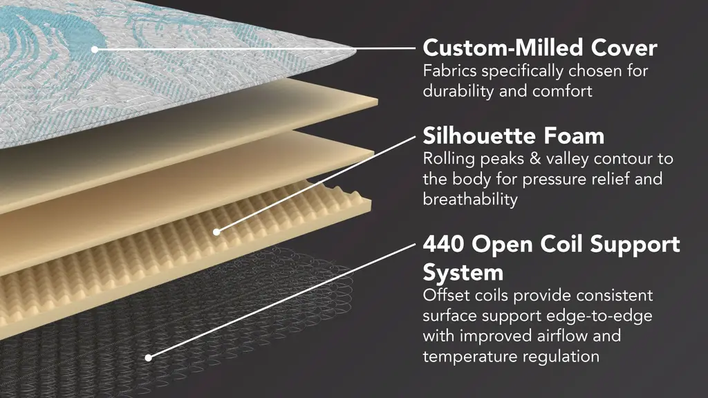 The Willa Euro top mattress features a unique peak-and-valley of Silhouette Comfort Foam that contours to your shape, offering targeted pressure relief and breathability. These innovative design features allow for a balanced sleep surface that adapts to your body's natural curves, ensuring an even distribution of weight and helping to reduce pressure points. The Open Coil System adds edge-to-edge support and more temperature regulation for your best night's sleep.