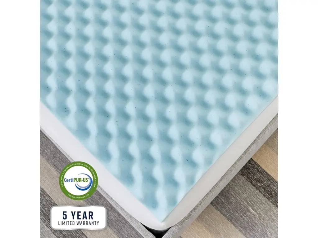 Rejuvenate your mattress with enhanced support and refreshing comfort found in the Gel-Infused Convoluted Memory Foam Mattress Topper. Two and a half inches of plush AeroFusion memory foam offers supportive spinal alignment to relieve pressure points and is infused with gel to promote heat dissipation so you can enjoy cooler sleep throughout the night. The convoluted construction evenly distributes body weight while allowing for maximum airflow. The odor free memory foam meets CertiPUR-US standards for content, emissions, and durability for long lasting comfort. Each gel infused mattress topper is backed by a 5-year limited warranty.