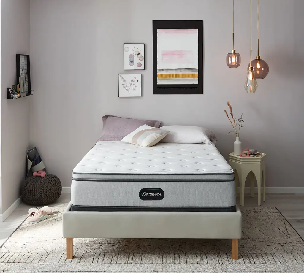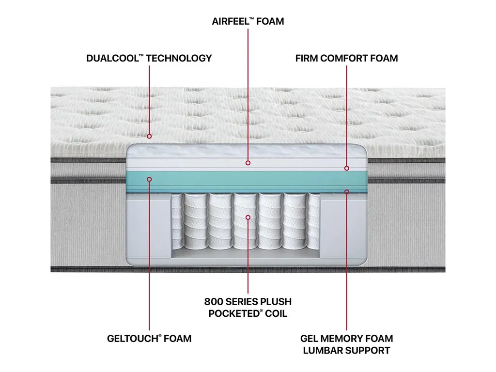 Experience the world’s premier support system with Beautyrest® BR800 13.5” plush pillow top mattress. It all started with Simmons introduction of the world's Premier Sleep System: Beautyrest® Pocketed Coil® springs which move individually to support the natural shape of your body, and diffuse movement for a peaceful, undisturbed rest. Featuring 800 Series Beautyrest® Pocketed Coil® Technology that provides flexible support precisely where it is needed and isolates motion between two sleepers. The DualCool™ Technology found in the BR800, is an antimicrobial performance layer that works to keep your mattress fresh and cool while moving heat and moisture away, so you sleep at your ideal sleeping temperature. Get soft support right where you need it most with Gel Memory Foam Lumbar Support.