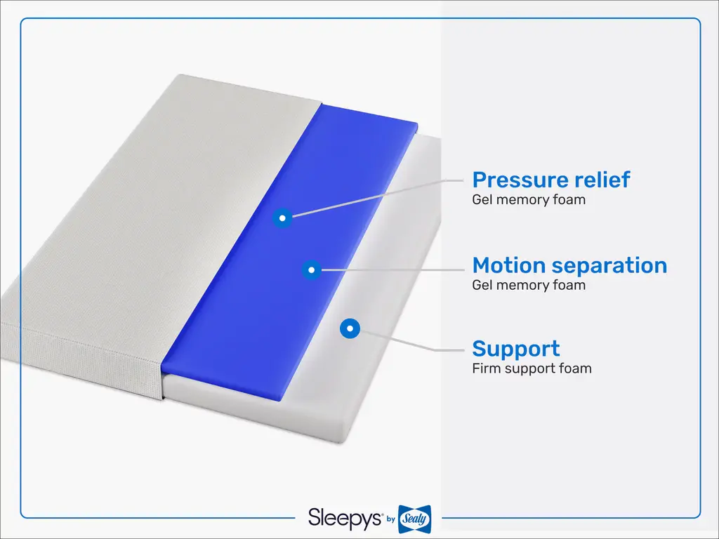 Experience all-night comfort with the Sleepy's by Sealy® Memory Foam Firm mattress—featuring customized support, motion isolation and pressure relief—straight out of a box for easy setup! Addressing many of the common sleep disruptors—like partner disturbance, aches, pains and more—the Sleepy's by Sealy Memory Foam Firm gives you the pressure relief and support you need throughout the night.This mattress is equipped with pressure-relieving gel memory foam, which cradles your body to alleviate aches and pains while reducing tossing and turning. It also delivers excellent motion isolation, meaning you and your partner can enjoy undisturbed sleep while also experiencing head-to-toe support.The Memory Foam Firm combines the expertise of two trusted brands, Sleepy’s and Sealy, to deliver a mattress that promotes deeper sleep at an incredible value. It also conveniently comes in a box, so you can simply unroll and get to dreaming faster.