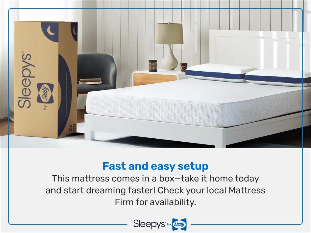 Experience all-night comfort with the Sleepy's by Sealy® Memory Foam Firm mattress—featuring customized support, motion isolation and pressure relief—straight out of a box for easy setup! Addressing many of the common sleep disruptors—like partner disturbance, aches, pains and more—the Sleepy's by Sealy Memory Foam Firm gives you the pressure relief and support you need throughout the night.This mattress is equipped with pressure-relieving gel memory foam, which cradles your body to alleviate aches and pains while reducing tossing and turning. It also delivers excellent motion isolation, meaning you and your partner can enjoy undisturbed sleep while also experiencing head-to-toe support.The Memory Foam Firm combines the expertise of two trusted brands, Sleepy’s and Sealy, to deliver a mattress that promotes deeper sleep at an incredible value. It also conveniently comes in a box, so you can simply unroll and get to dreaming faster.