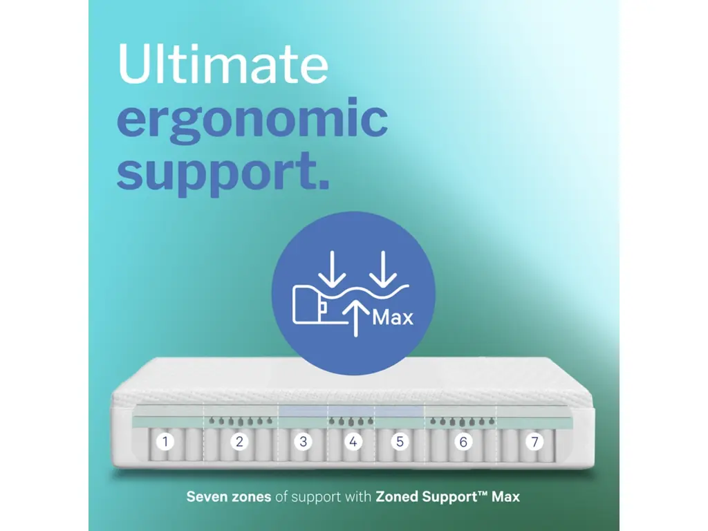 Inside the Snow Max: Our ultimate cooling hybrid mattress. Engineered with precision-cut foam and encased coils for a breathable and supportive medium-soft feel and Snow Technology for 12+ hours of cooler sleep. Best Solution For: Hot Sleepers, aches and pains, tossing and turning and side sleepers. Specialty cool to the touch fibers in the Snow Cover give an instantly refreshing feel to help you get cozy. Experience ultimate support with Zoned Support Max. Firmer center foam plus a layer of precisely cut channels that cradle the natural curve of your body while giving added support to your hips, waist, and lower back. More Phase Change Material and HeatDelete Bands than Snow remove excess body heat and help you sleep cooler all night long. Designed with a unique slow melt feel, ultra-supportive Align+ Memory Foam keeps you aligned for your deepest sleep. Individually pocketed Flex Coils flex to your body to reduce motion transfer and boost support.