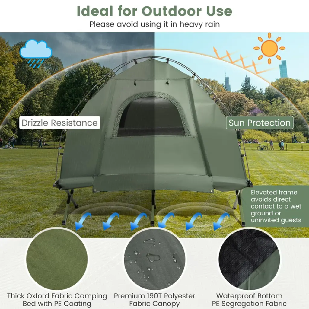A Versatile Camping Combo Designed to Enhance Your Outdoor Experience! Our foldable 1-person camping tent cot includes a camping cot, a camping tent, a sleeping bag, and an air mattress and pillow with cover, and each component can be used individually or combined for ultimate convenience. Particularly, our air mattress is upgraded, which adopts coil beam support constructions, providing reliable support for a restful sleep. Other than that, it adopts thick oxford fabric camping bed with PE coating and premium 190T polyester fabric canopy, providing added protection against sun and light rain, which is ideal for outdoor use. Thanks to the 17" elevated bottom and waterproof bottom tarp, the sleep shelter can keep away from wet mud and uninvited guests. To enhance stability and safety, we provide 14 ground stakes and 10 wind ropes for firmly fixing the tent into the soil or sand. Besides, it can be easily folded and stored in a carrying bag, and it only weighs 29 lbs, allowing for effortless transportation.Features5-in-1 multifunctional design: camping combo, camping cot, tent, sleeping bag, beddings The door can be supported by 2 poles, turning into a large front sunshade The upgraded air mattress with coil beam support construction is more comfortable The double-sided mattress features a soft flocking side and a cool PVC side The canopy is made of 190T polyester fabric, providing better sun and drizzle protection The camping bed is made of thick oxford fabric with PE coating, not easy to wear or tear The elevated frame avoids direct contact to a wet ground or uninvited guests Features a large door and 3 mesh windows for excellent ventilation and unobstructed views Foldable and portable design, easy to install and detach, comes with a carrying bag for storage Equipped with 14 ground stakes and 10 wind ropes, ensuring a stable and sturdy structure The anti-slip and anti-sink footpads ensure that the bed remains stable even on the soft groundColor: Green Material: Metal, FRP, 190T Polyester Fabric, PE-Coated Oxford Fabric Overall Dimension: 77" x 35" x 66" (L x W x H) Inner Size of Tent (Combined State): 73" x 30" x 40" (L x W x H) Size of Air Mattress: 30" x 73" x 9" (L x W x H) Size of Carry Bag: 36" x 10" x 10" (L x W x H) Height of Camping Bed: 17" Size of Pillow: 17" x 11" x 4.5" (L x W x H) Load Capacity: 300 lbs Net Weight: 29 lbs Package Includes: 1 x 1-Person Camping Tent Cot 14 x Ground Stake 10 x Wind Rope 1 x Pump 1 x Carrying Bag 1 x User Guide