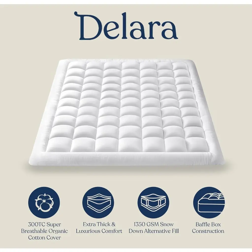 Delara Organic Extra Plush Mattress Pad, Cooling Quilted, Recycled Down Alternative, 20" Deep Pocket, Breathable & Noiseless, King