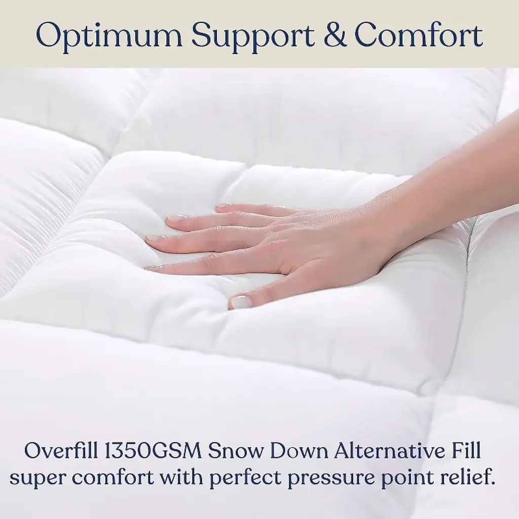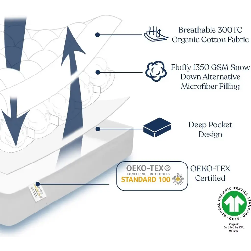 Delara 1350 GSM Snow Down Alternative Fill mattress pad provides you with a heavenly sleeping experience. It has been made with loft microfiber down-alternative fill that fluffs incredibly to give you a cozy feel and most relaxing sleep. The cover is made of 100% Certified organic cotton fabric that gives superior comfort against your skin. Box quilting looks elegant while keeping fill even and smooth. Stretch skirting with deep-pocket design and durable elastic creates a smooth, secure fit. With this mattress pad, you can protect your mattress, change the softness or firmness, or give yourself an extra layer of luxury to sleep on.