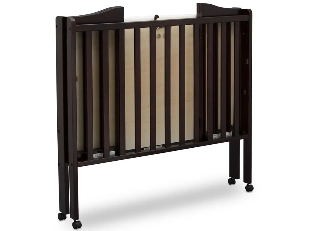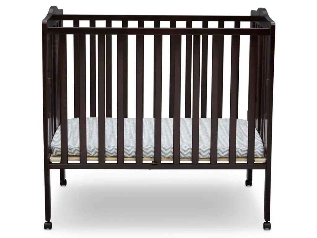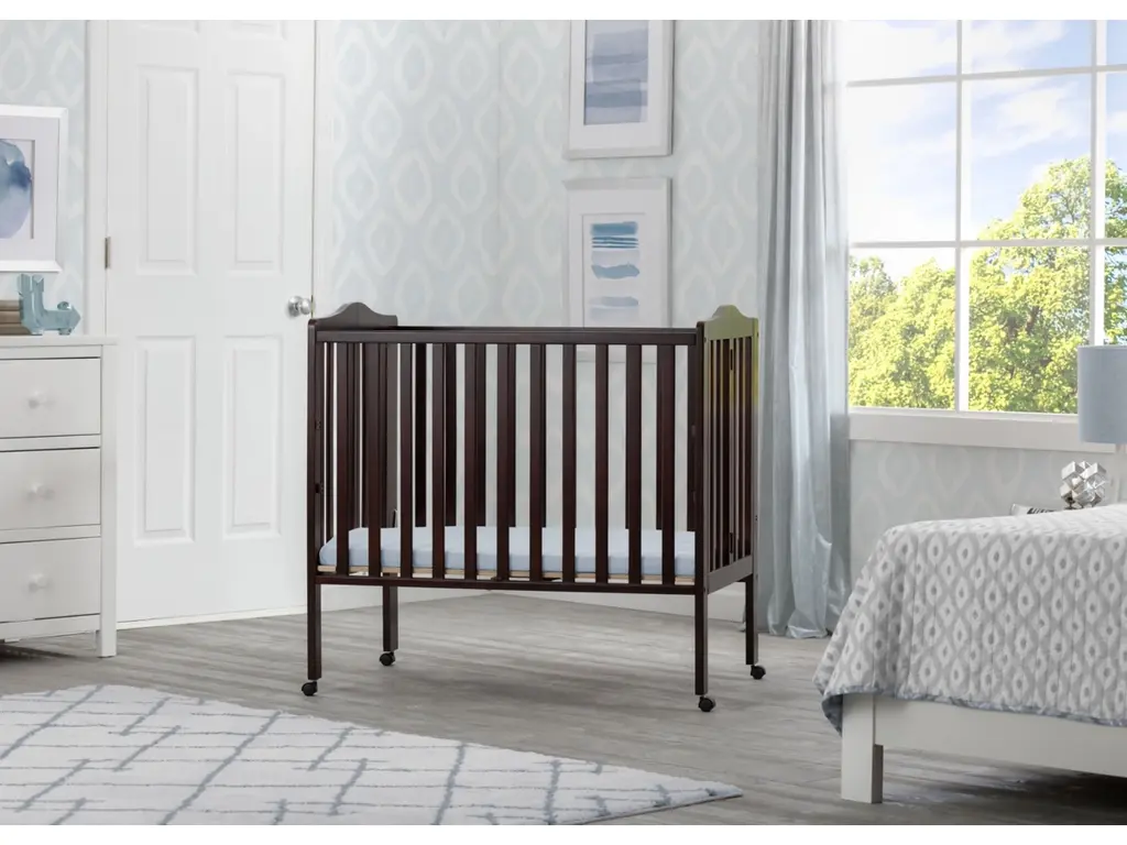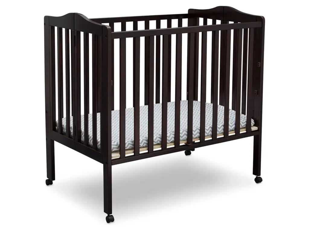 Great for small spaces or as a travel crib, the Portable Folding Crib with Mattress from Delta Children delivers the same versatility and style as a full-size crib, just in a scaled-down size. Its rolling casters allow for easy movement throughout the home, so you can keep your baby nearby at all times. When you’re on the go, it’s easier than ever to provide a safe and comfy sleep space for your little one. Made from durable wood, it folds easily making it perfect for transport. Designed for convenience, the Portable Folding Crib with Mattress from Delta Children includes everything needed for a good night's sleep. Includes mini-crib mattress.