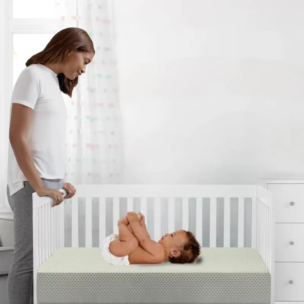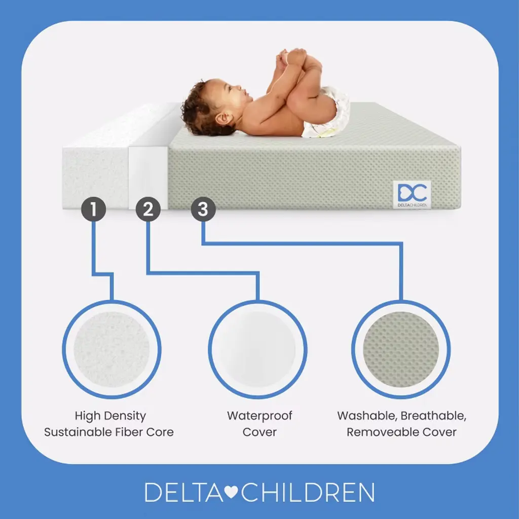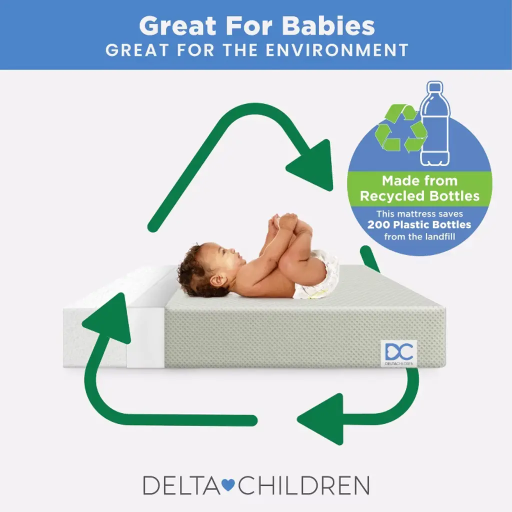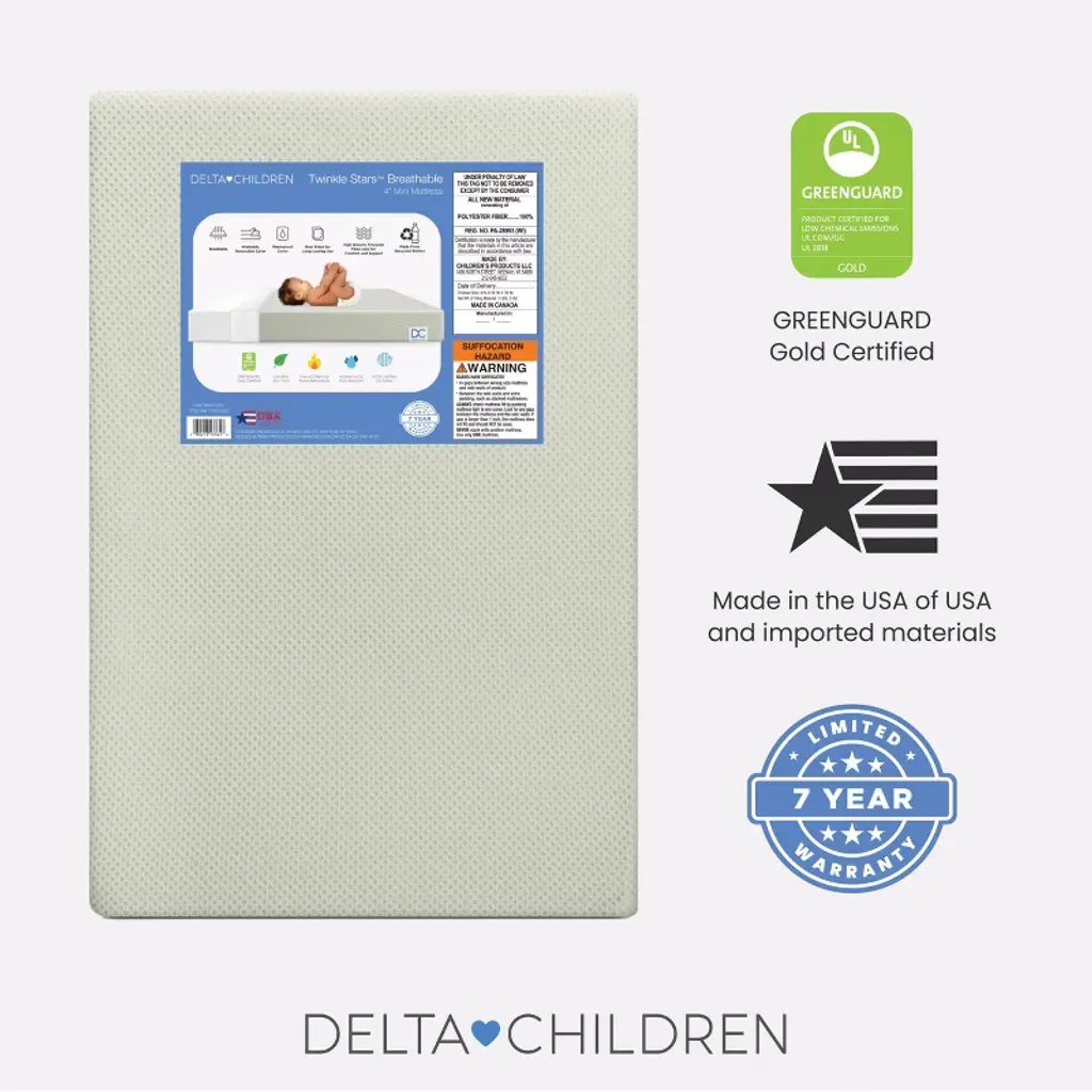 Achieve a safer, longer, happier sleep for your baby (and you!) with the Twinkle Stars Breathable 4-inch Mini Crib Mattress by Delta Children. Topped with a breathable cover, the three-dimensional mesh fabric allows air to flow through the cover fabric and under baby, promoting continuous airflow and helping regulate baby’s temperature for a comfortable sleeping environment. For easy cleanup, the fully removable cover is machine washable while the waterproof and hypoallergenic mattress encasement wipes clean. At its core, this mini crib mattress features a fiber construction made from recycled bottles that delivers the ideal firmness level for newborns, infants and toddlers while helping save over plastic bottles from the landfill--great for babies, great for the environment. Get the Twinkle Stars Breathable Mini Crib Mattress by Delta Children for your little one and breathe easy every night.This crib mattress is GREENGUARD Gold certified. Tested to meet or exceed the most stringent chemical emissions standards to create a healthier home for your baby, it has been screened for more than 10,000 chemicals and VOCs that are known to pollute indoor air. Certified to contribute to cleaner indoor air, you can feel good about putting this mattress in your child’s nursery.
