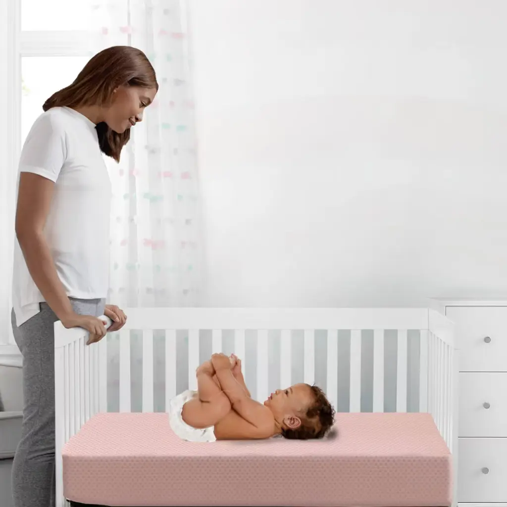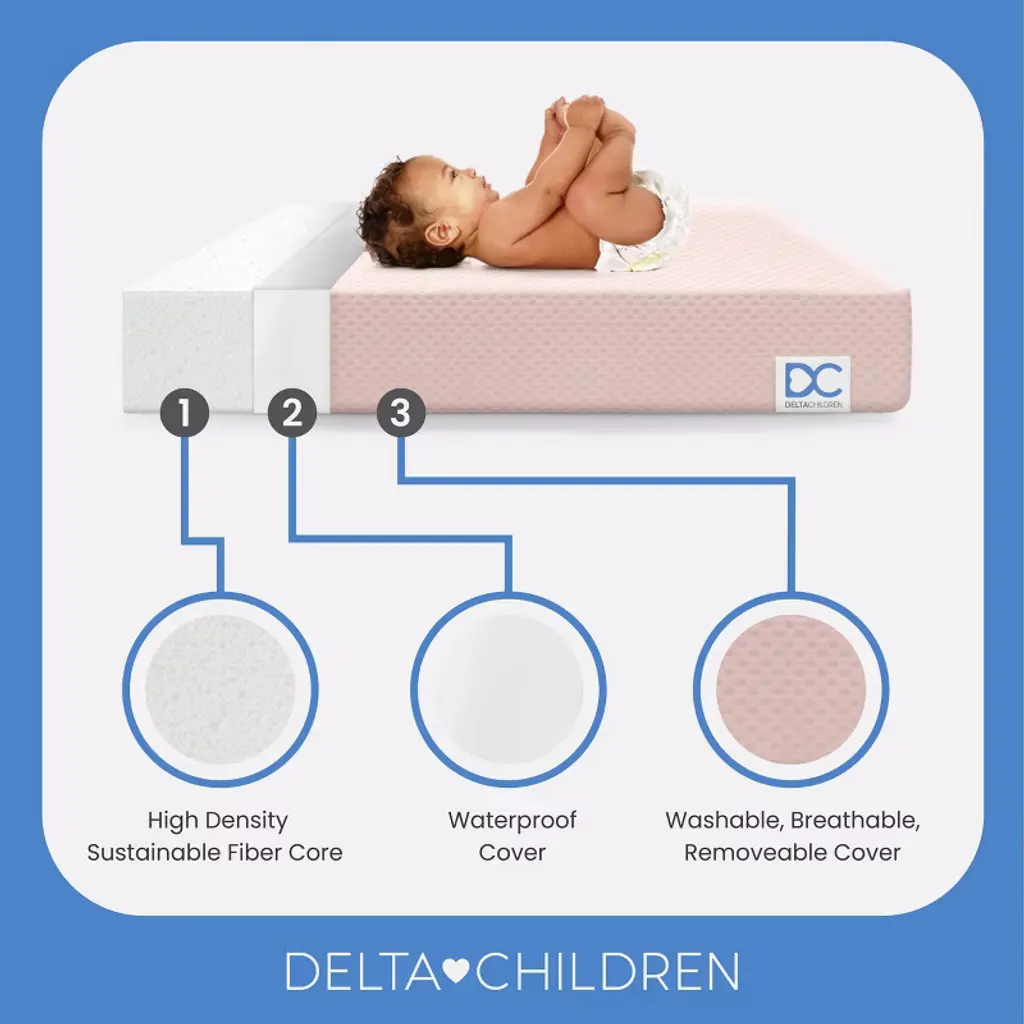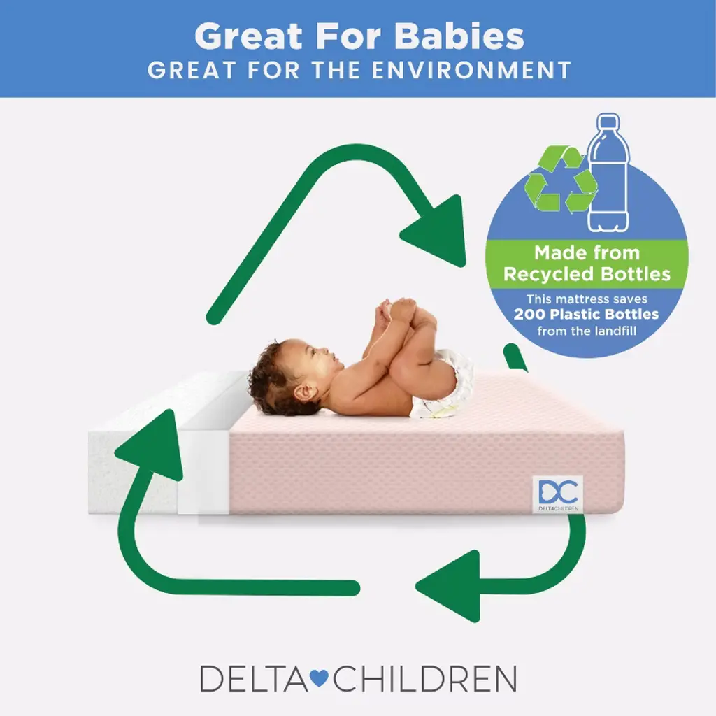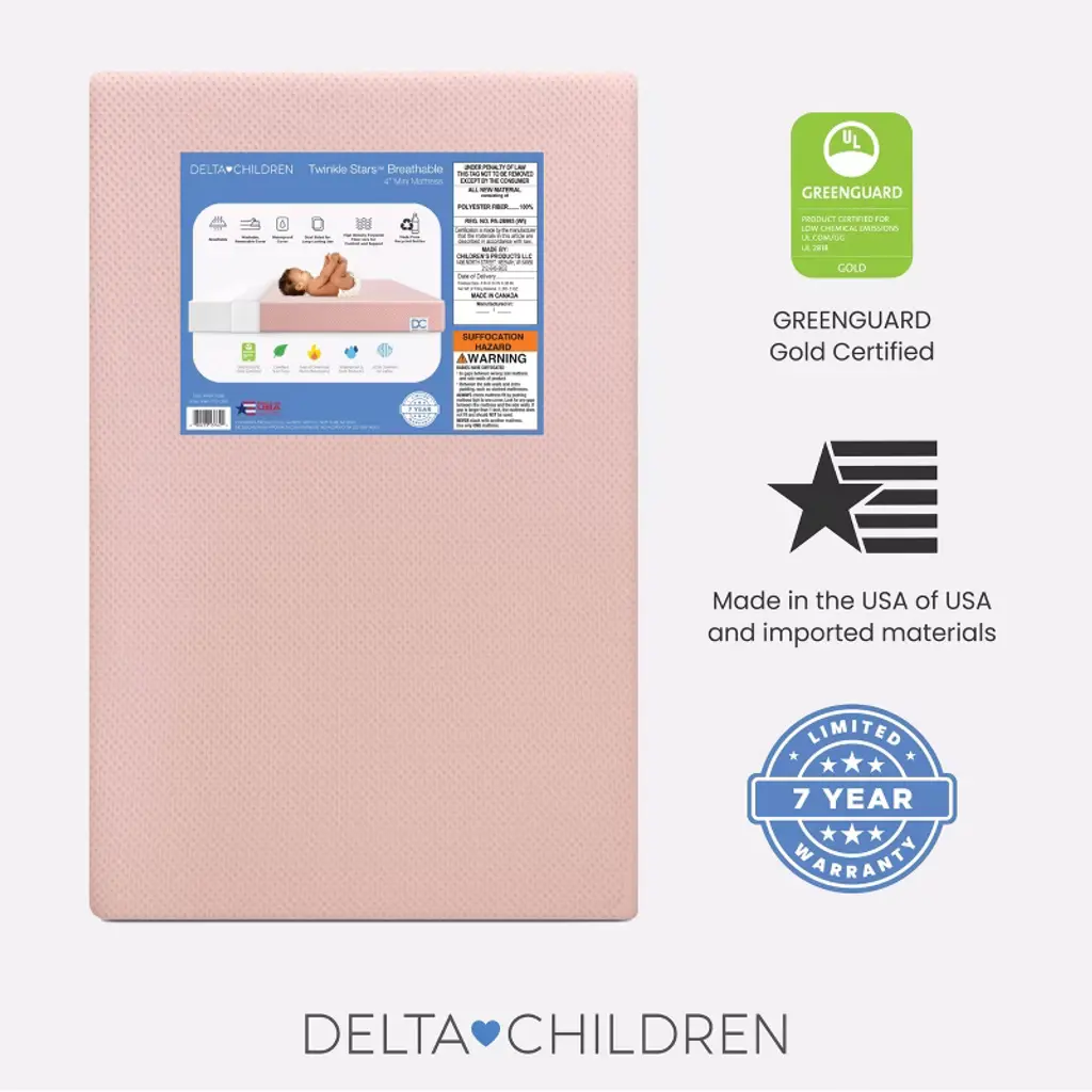 Achieve a safer, longer, happier sleep for your baby (and you!) with the Twinkle Stars Breathable 4-inch Mini Crib Mattress by Delta Children. Topped with a breathable cover, the three-dimensional mesh fabric allows air to flow through the cover fabric and under baby, promoting continuous airflow and helping regulate baby’s temperature for a comfortable sleeping environment. For easy cleanup, the fully removable cover is machine washable while the waterproof and hypoallergenic mattress encasement wipes clean. At its core, this mini crib mattress features a fiber construction made from recycled bottles that delivers the ideal firmness level for newborns, infants and toddlers while helping save over plastic bottles from the landfill--great for babies, great for the environment. Get the Twinkle Stars Breathable Mini Crib Mattress by Delta Children for your little one and breathe easy every night.This crib mattress is GREENGUARD Gold certified. Tested to meet or exceed the most stringent chemical emissions standards to create a healthier home for your baby, it has been screened for more than 10,000 chemicals and VOCs that are known to pollute indoor air. Certified to contribute to cleaner indoor air, you can feel good about putting this mattress in your child’s nursery.