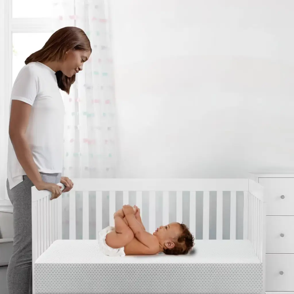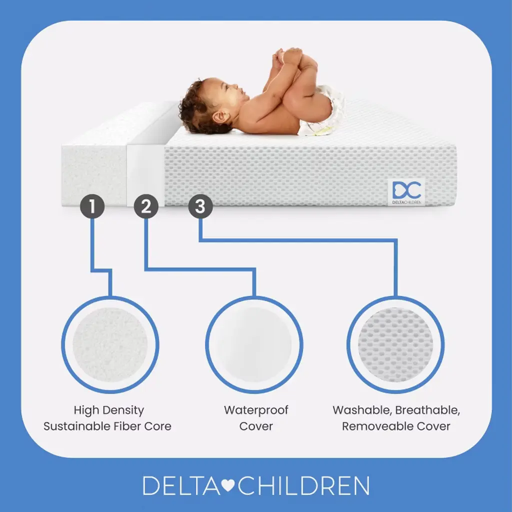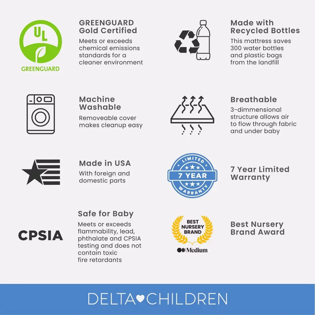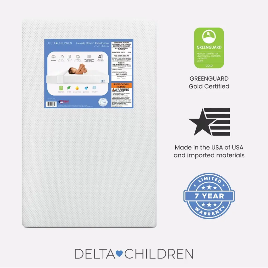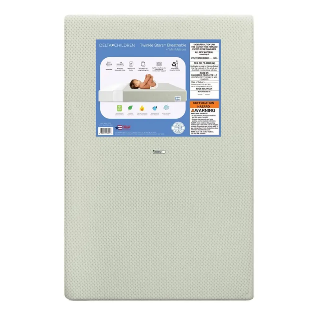 Achieve a safer, longer, happier sleep for your baby (and you!) with the Twinkle Stars Breathable 4-inch Mini Crib Mattress by Delta Children. Topped with a breathable cover, the three-dimensional mesh fabric allows air to flow through the cover fabric and under baby, promoting continuous airflow and helping regulate baby’s temperature for a comfortable sleeping environment. For easy cleanup, the fully removable cover is machine washable while the waterproof and hypoallergenic mattress encasement wipes clean. At its core, this mini crib mattress features a fiber construction made from recycled bottles that delivers the ideal firmness level for newborns, infants and toddlers while helping save over plastic bottles from the landfill--great for babies, great for the environment. Get the Twinkle Stars Breathable Mini Crib Mattress by Delta Children for your little one and breathe easy every night.This crib mattress is GREENGUARD Gold certified. Tested to meet or exceed the most stringent chemical emissions standards to create a healthier home for your baby, it has been screened for more than 10,000 chemicals and VOCs that are known to pollute indoor air. Certified to contribute to cleaner indoor air, you can feel good about putting this mattress in your child’s nursery.