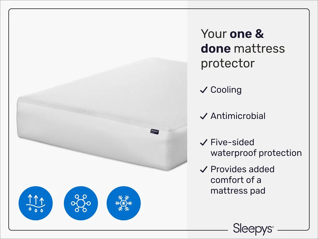 This Sleepy's Deluxe Comfort Cool Mattress Protector checks all the boxes: it’s cooling, fully waterproof, anti-microbial, and provides the added comfort of a mattress pad—all while shielding your mattress from stains, allergens, dust mites & more. Plus, five-sided protection and an antimicrobial Silvadur treatment fights bacteria so you can rest easy. The cushioned protector feels like a cooling mattress pad with all the benefits of a waterproof protector—at a great value.