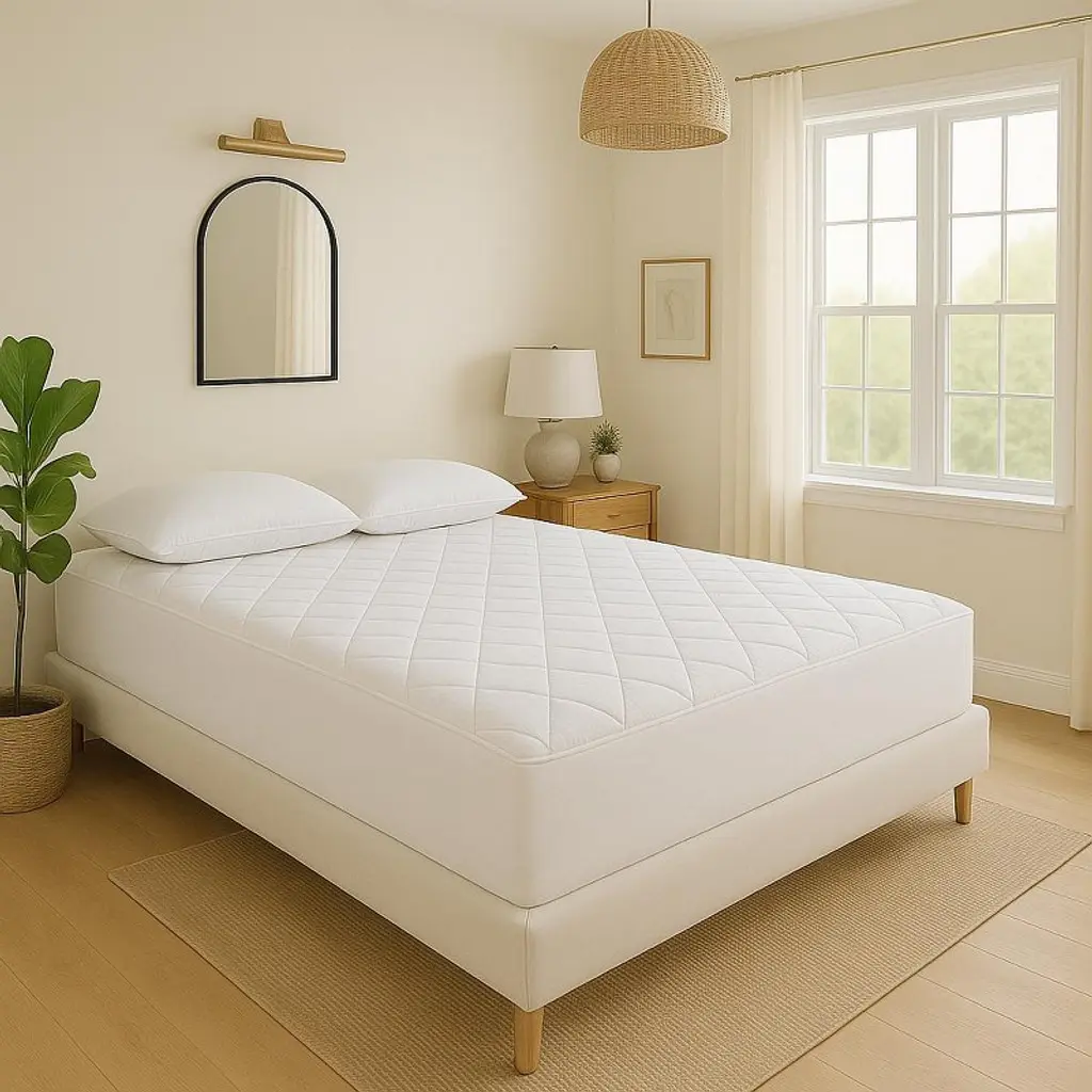Mattress pad and cover. No bed is complete without a mattress pad, and not all are created equal. This luxury mattress pad adds an extra layer of fluff, comfort, and protection. The quilted top provides an airy, light feel, and the sides stretch to snugly contour the mattress. The quilting ensures no bumps or lumps, just continuous comfort. Conveniently machine washable/dryer safe. Naturally non-allergenic cotton, a perfect choice for masters, guest or kids bedroom.