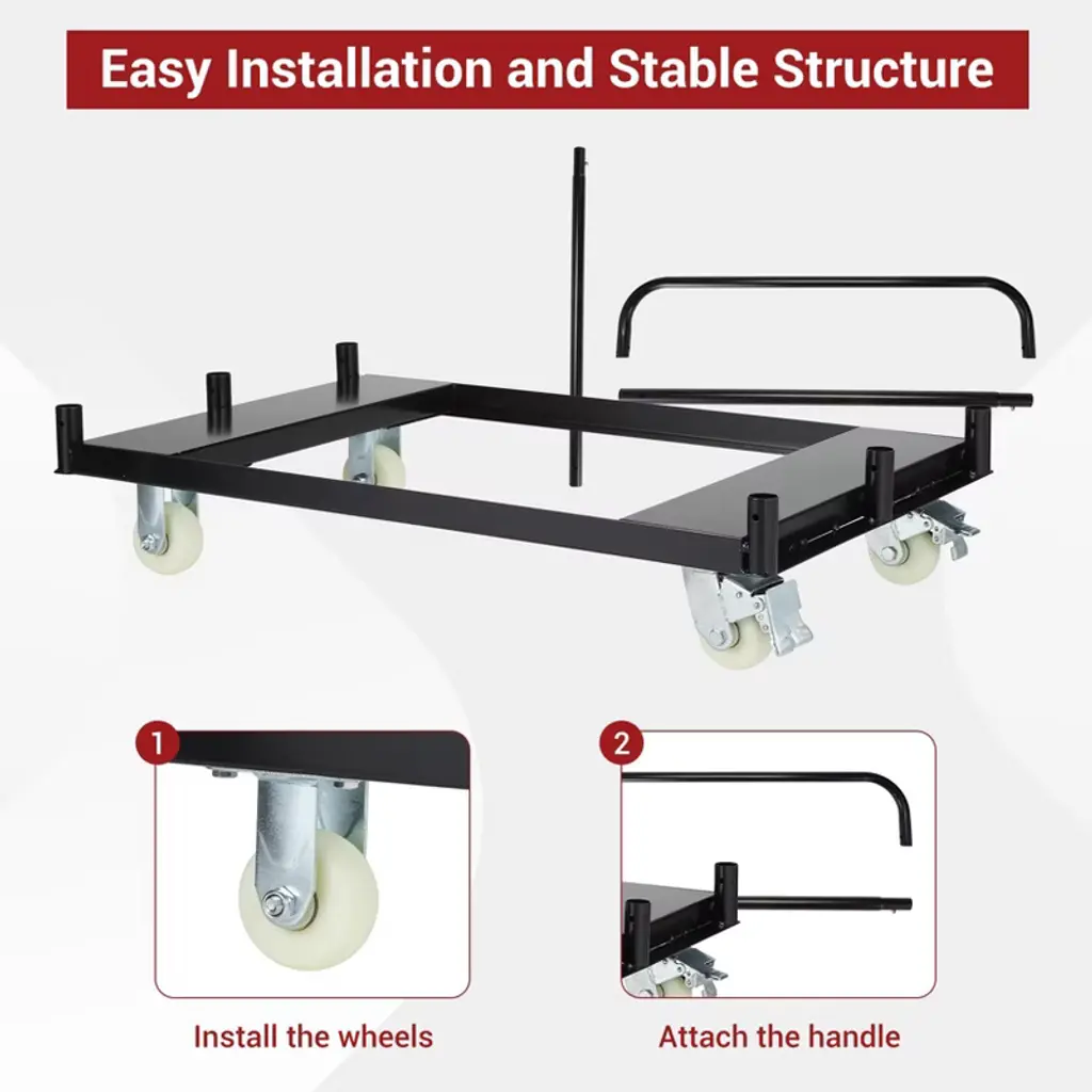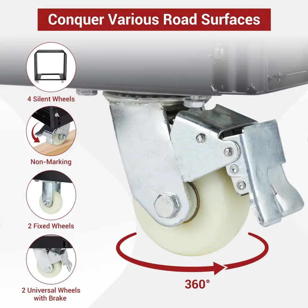 Industrial 1500LBS Load Capacity & Reinforced FrameEngineered with high-tensile ASTM A1008 steel tubing (1.5mm wall thickness), this cart supports professional-grade loads up to 1,500 lbs. The triple-riveted crossbeams prevent flex under stress when transporting 4¡¯x8¡¯ drywall sheets or bulk lumber, outperforming generic carts by 40% in deformation resistance. Optimized Mobility with Dual-Wheel SystemFeatures two 4" 360¡ã swivel casters + two fixed wheels with polyurethane treads and sealed ball bearings. The zero-torque steering design enables pivoting in 8-inch aisles, while non-marking wheels operate at <65 dB on concrete¡ªideal for hospital remodels or noise-sensitive sites. Rust-Proof ArmorShield? Coating & Lifetime StructureTriple-layer electrostatic powder coating (120¦Ìm) with zinc chromate primer creates a salt-fog resistant barrier (ASTM B117-19 certified), surviving chemical spills, UV exposure, and -4¡ãF to 212¡ãF temperatures. Outlasts epoxy-painted competitors by 200% in accelerated corrosion tests. Tool-Free 10-Second Folding & OSHA-Compliant SafetyPatented single-pin folding mechanism collapses the 48"x24" platform to 5" depth in one motion. Non-slip diamond-plate decking and dual-lock safety rails prevent load shift during transport. Exceeds ANSI MH30.2 standards with a 3:1 safety factor at max capacity. Multi-Industry Versatility & Ergonomic HandlingLow-profile 2.3" deck height allows roll-on loading for sheet goods, mattresses, or palletized items. Forklift pockets (3" clearance) enable vertical storage. Used by construction crews, warehouse logistics (e.g., Grainger-grade applications), and event planners for staging equipment.