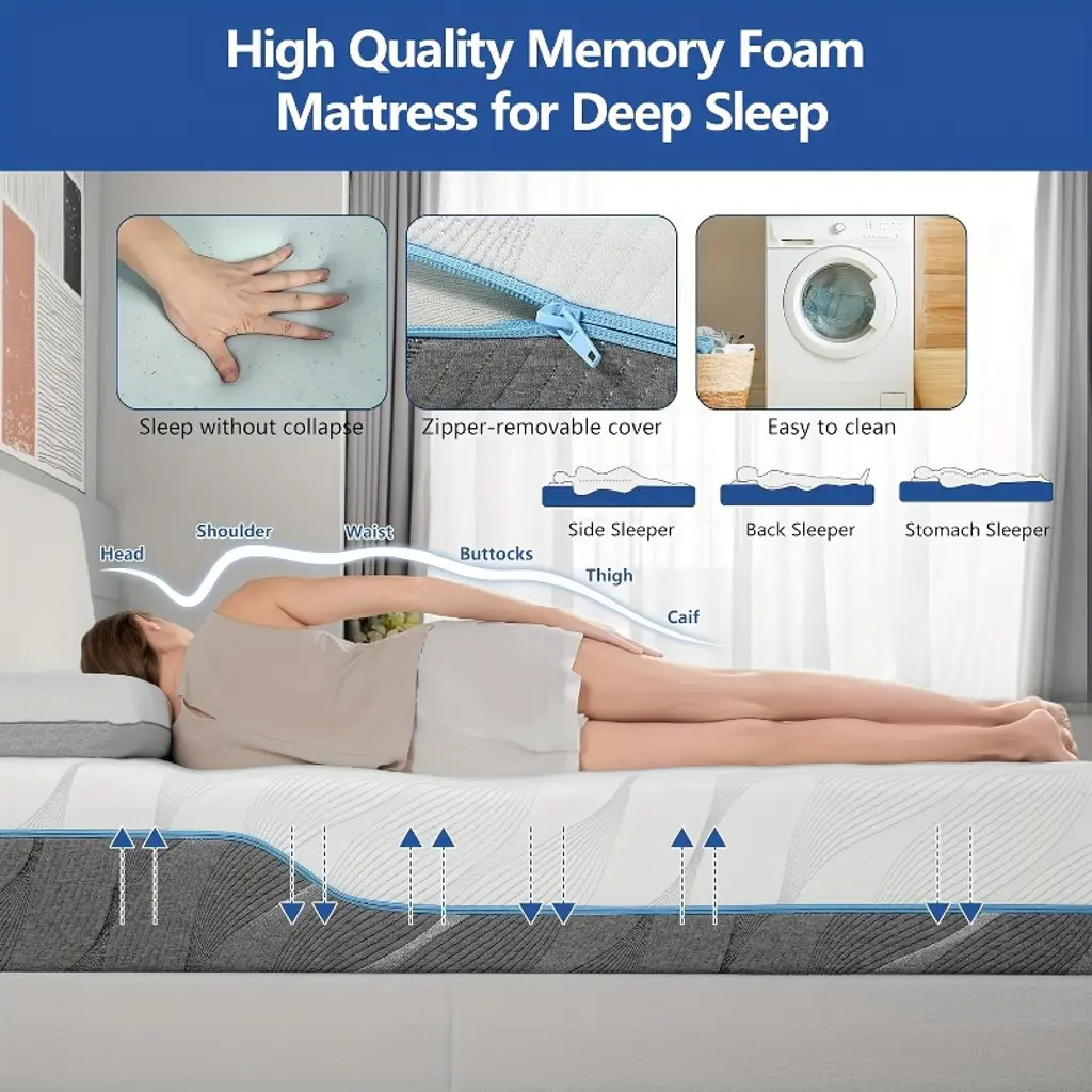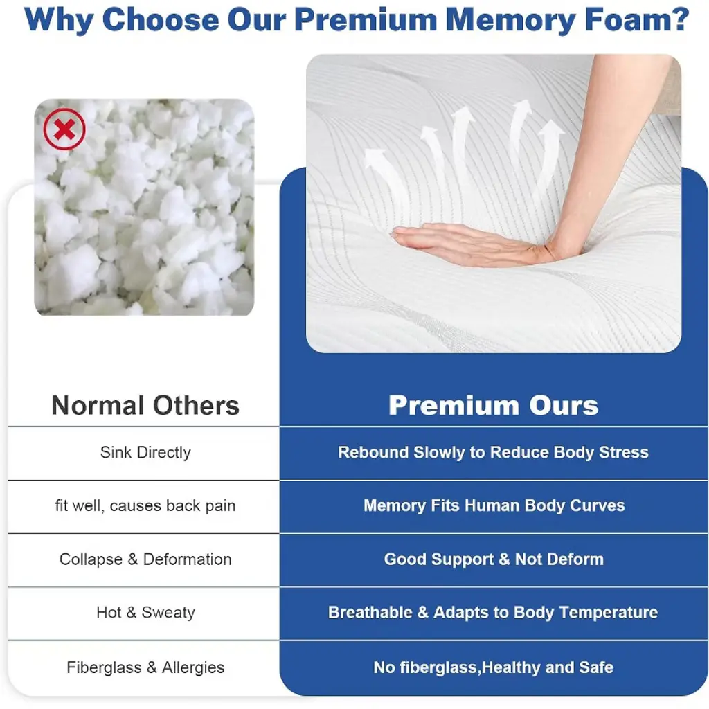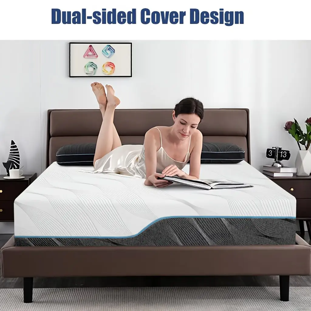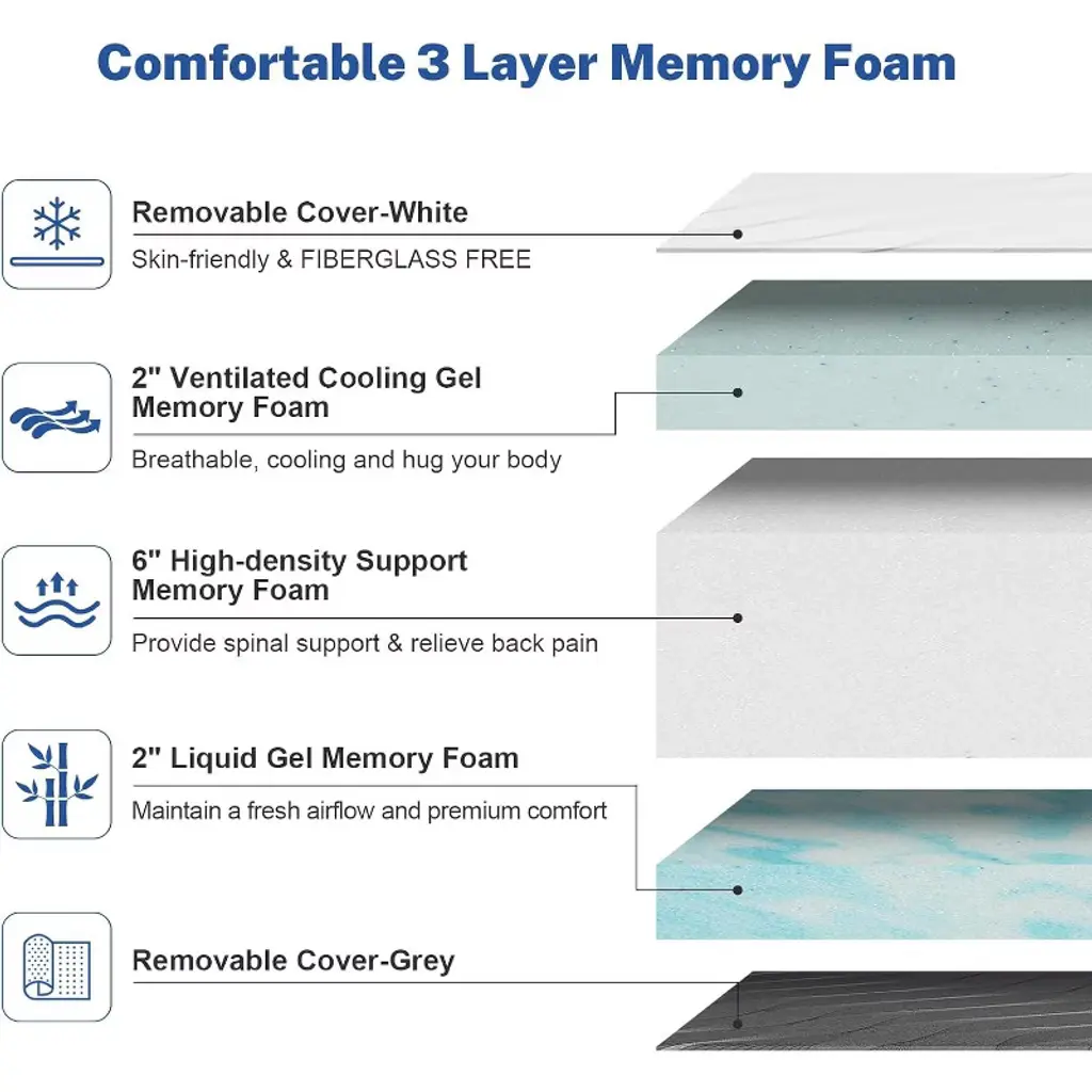 1.Premium Memory Foam Mattress Our mattress-in-a-box combines premium gel foam and bamboo memory foam, a fiberglass-free dual-sided cover, and medium-to-extra firm support for back pain relief. Enjoy low motion transfer and luxurious, restful sleep. 2.Adjustable Firmness for Custom Comfort Upgraded design offers medium to extra firm options¡ªmore breathable and durable than traditional toppers. Flip the foam layer to customize firmness and balance comfort with support. 3.Fiberglass-Free & Skin-Friendly Cover The odor-free, skin-friendly cover (white on one side, stylish grey on the other) is fiberglass-free, ensuring safe, stress-free sleep. Choose the side that matches your mood. 4.Certified Safety & USA-Made Quality Manufactured in Fontana, California, with strict quality control. Certified by CertiPUR-US? and Oeko-Tex? Standard 100¡ªsafe for families, including pregnant women and babies. 5.Hassle-Free Warranty & Setup 365-night trial + lifetime warranty. Compressed in a box for easy transport: unpack, stretch, and allow 24¨C48 hours to fully expand. Perfect for quick bedroom upgrades.