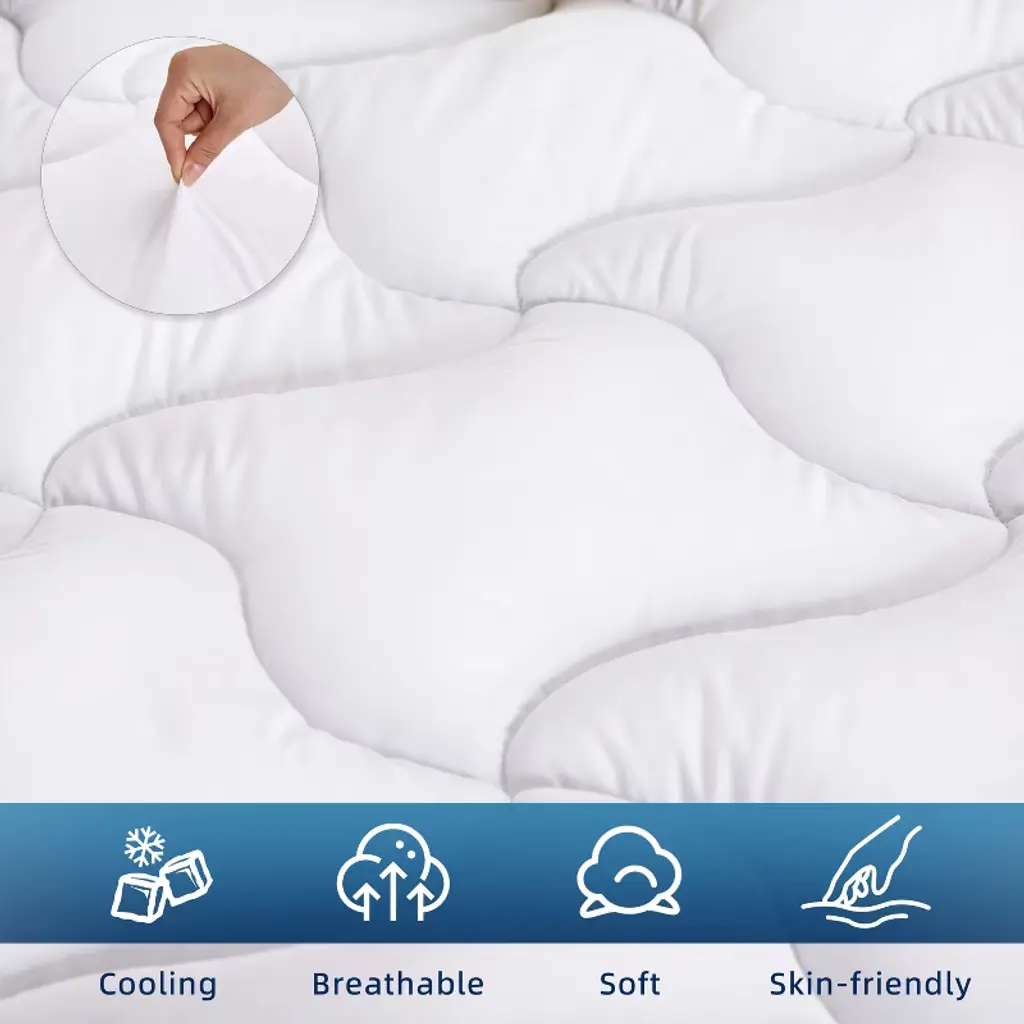 【2-in-1 Dual Layer Comfort】AMICLIBER’s pillow top mattress topper combines 2" cooling gel memory foam & 1" quilted snow pile for cloud-like softness and pressure relief—perfect for back, hip, and neck support. 【5-Zone Pain Relief】 Ergonomic memory foam evenly distributes weight, aligns your spine, and reduces pressure points—enhancing deep sleep by 30% for a refreshed morning. 【Stay Cool All Night】 3D breathable mesh + gel-infused foam dissipates heat, keeping you cool. No more night sweats—just uninterrupted, temperature-regulated sleep. 【Hypoallergenic & Safe】 OEKO-TEX & CertiPUR-US certified with ultra-soft snow velvet cover. Gentle on skin, free from allergens, and easy to machine wash. 【Secure Fit & 10-Year Warranty】 Deep pocket (8"-21") stays snug on any mattress. Vacuum-packed—just allow 24-48 hours to expand. Worry-free decade of comfort!