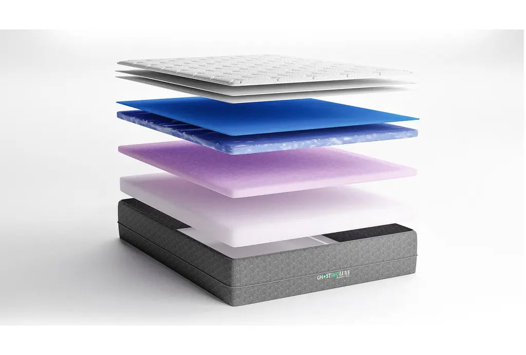 Experience ultimate comfort with the Ghostbed Luxe Queen 13" Profile Mattress. This bed in a box combines advanced materials to provide a cool and supportive sleep surface. Designed with a white and grey color scheme, this mattress is both stylish and functional.