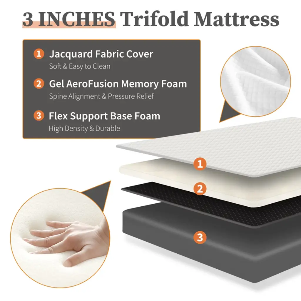 Gulches Tri-Fold Memory Foam Mattress blends functionality and comfort: its high-quality memory foam delivers excellent cushioning, great for lounging, reading, or relieving tiredness. The three-fold design lets you fold and stow it effortlessly, maximizing living space. With a removable, washable cover, keeping it clean is hassle-free. Use it indoors for guests, outdoors for camping, or on trips¡ªperfect for yoga, kids¡¯ play, or any scenario needing extra cozy support.