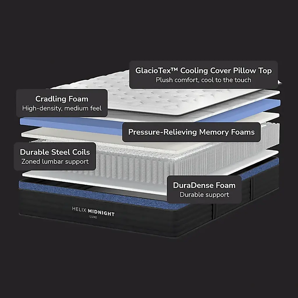 The Midnight Luxe is Helix's most popular premium mattress designed with a medium-feel and multiple layers of high-quality memory foam for comforting pressure relief at your hips and shoulders. This mattress includes a plush pillow top, 3 layers of high-density foam, and individually wrapped steel coils with zoned lumbar support and a fully reinforced perimeter. The Midnight Luxe features our upgraded GlacioTex Cooling Cover to provide enhanced cooling while you sleep.