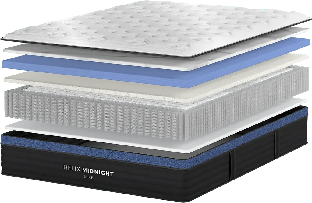 The Midnight Luxe is Helix's most popular premium mattress designed with a medium-feel and multiple layers of high-quality memory foam for comforting pressure relief at your hips and shoulders. This mattress includes a plush pillow top, 3 layers of high-density foam, and individually wrapped steel coils with zoned lumbar support and a fully reinforced perimeter. The Midnight Luxe features our upgraded GlacioTex Cooling Cover to provide enhanced cooling while you sleep. Conveniently raise or lower the head of your mattress using the RTG Sleep 2900 adjustable base with wireless remote control.