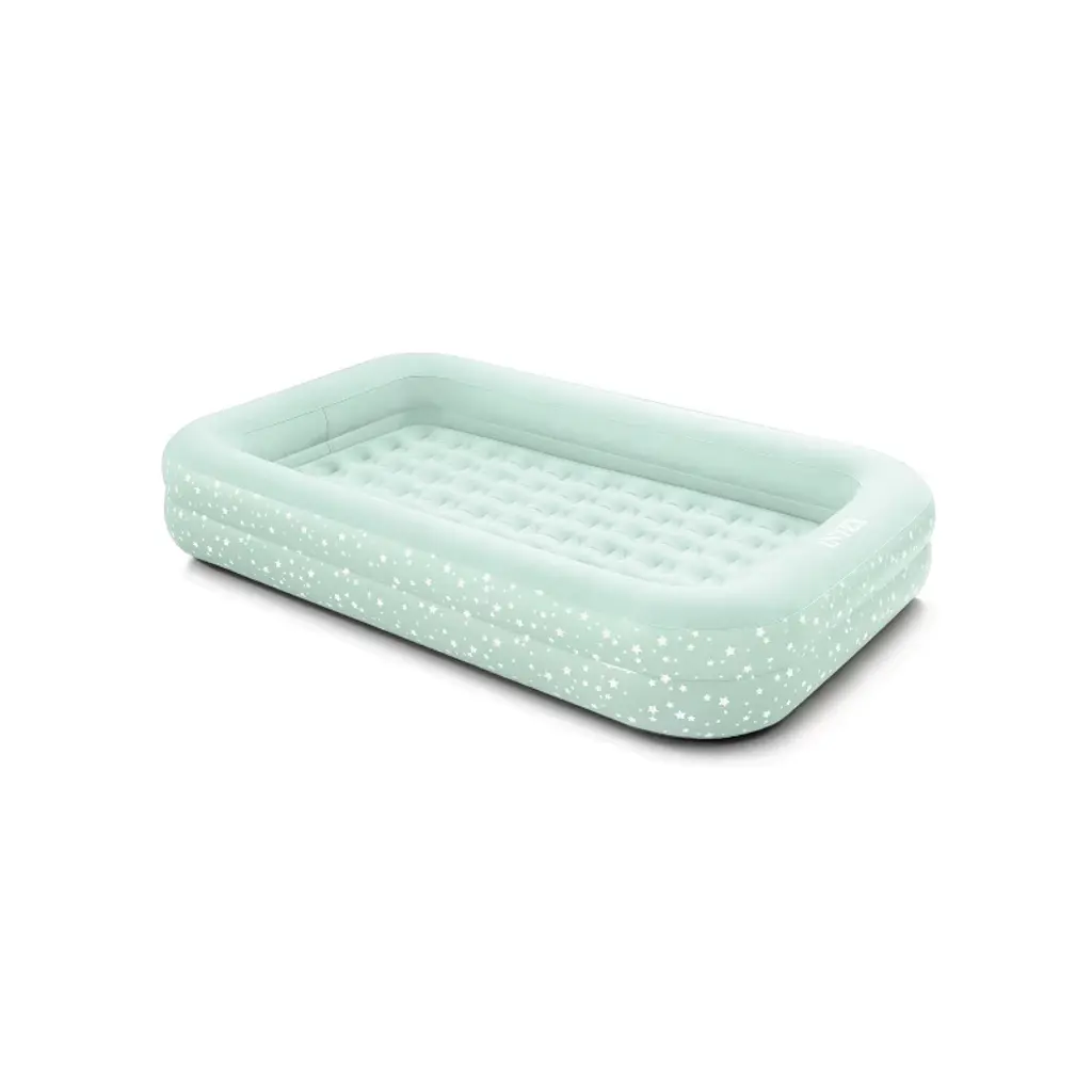 Elevate your kids’ sleep experience on the road. The INTEX® Kidz Travel Bed Set doubles up on comfort with a removable inner mattress that fits snugly within the borders of the primary bed. Best of all, standard crib sheets fit this bed! Use the included QuickFill® handheld air pump to easily inflate or deflate the product. Between uses—or while traveling—just deflate and fold the mattress, then stuff it into the included carry bag.