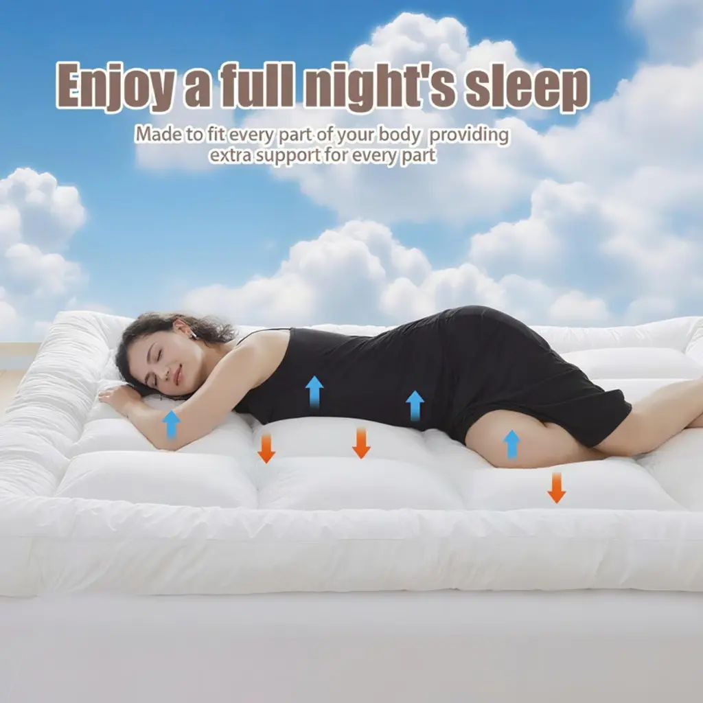Discover the ultimate sleep upgrade with our memory foam mattress topper. It's filled with 2000GSM shredded memory foam and thicked down alternative lining, offering a skin - friendly and fluffy feel. Unlike block memory foam toppers that can cause body aches, this topper is breathable and has a fast rebound. The 4 stable anchor elastic straps keep it firmly in place, and the diamond - quilted design ensures even filling distribution. Vacuum compressed, it just needs a pat and 24 hours to reach full fluffiness. Perfect for those with back pain, it provides soft support for a better night's sleep.