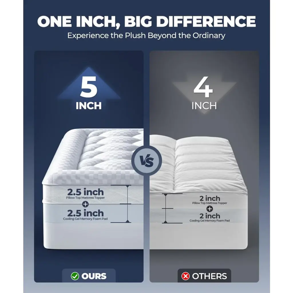 Itopfox 5 Inch Mega Support Memory Foam Queen Mattress Topper For Pressure Relief, Dual Layer Pillow Top Plus Cooling Gel Infused Memory Foam Pad