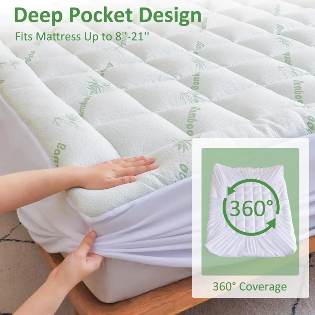 Upgrade your sleep with this cooling mattress topper. It's made of breathable viscose from bamboo, which offers a cool and refreshing feel. The deep - pocket design fits mattresses 8 - 21 inches thick, making it suitable for most beds. With cloud - like softness and perfectly balanced comfort, it provides gentle support and helps relieve back pain. It's also machine - washable, so you can keep it fresh and hygienic easily. Ideal for anyone seeking a better night's sleep, this mattress topper is a must - have for a comfortable bedroom.