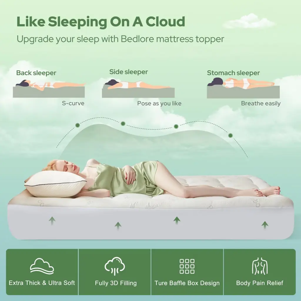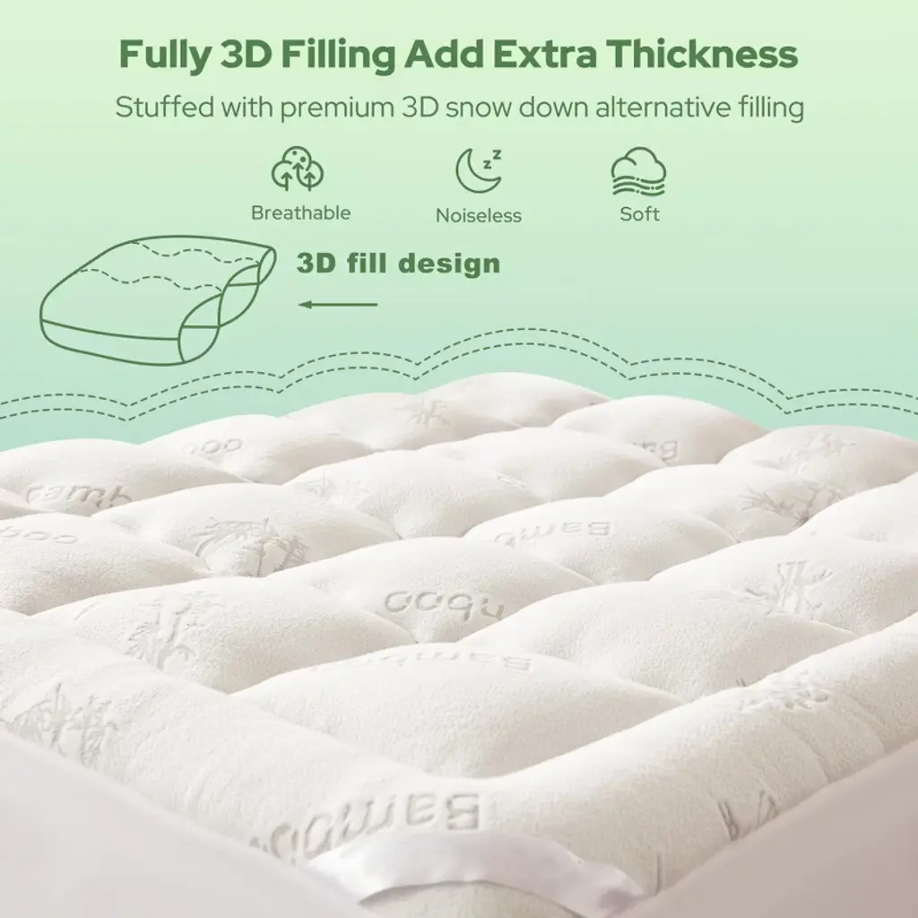Enhance your sleep with this premium mattress topper. Crafted from 40% bamboo viscose and 60% polyester, it offers a unique combination of softness and breathability. Ideal for sensitive sleepers, it keeps you cool and comfortable all night. The deep elastic pocket design and elasticized bed skirt ensure a secure fit, preventing the topper from shifting. It's machine - washable, making maintenance a breeze. Whether you're looking to relieve back pain or simply upgrade your sleep, this mattress topper is a perfect choice for your bed.