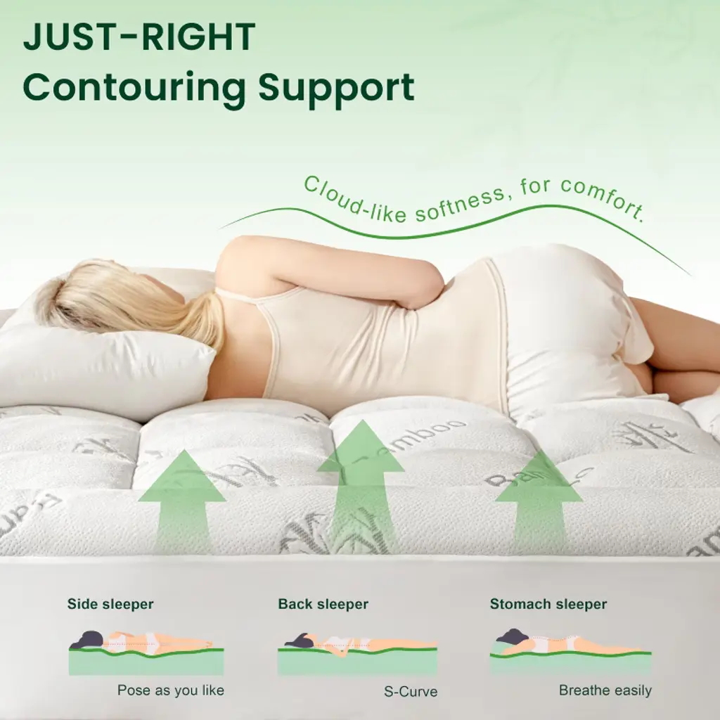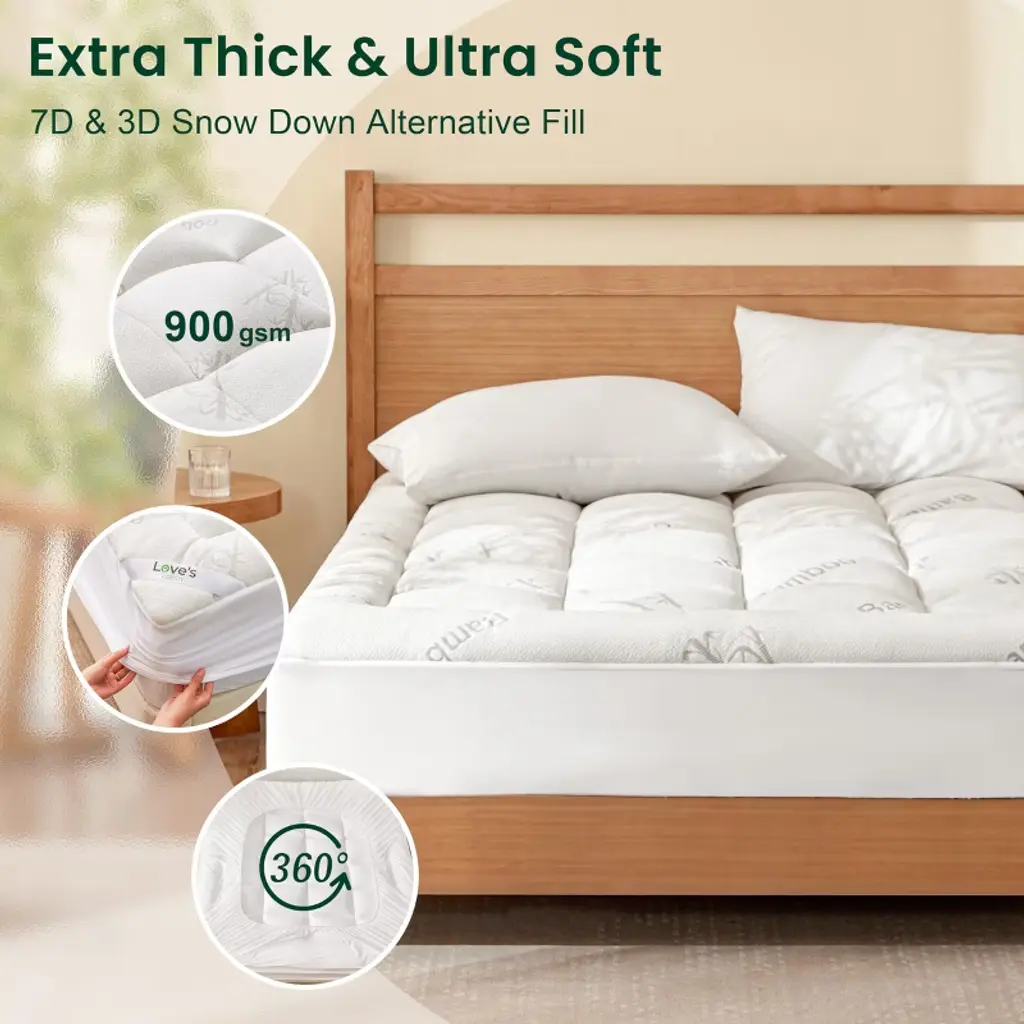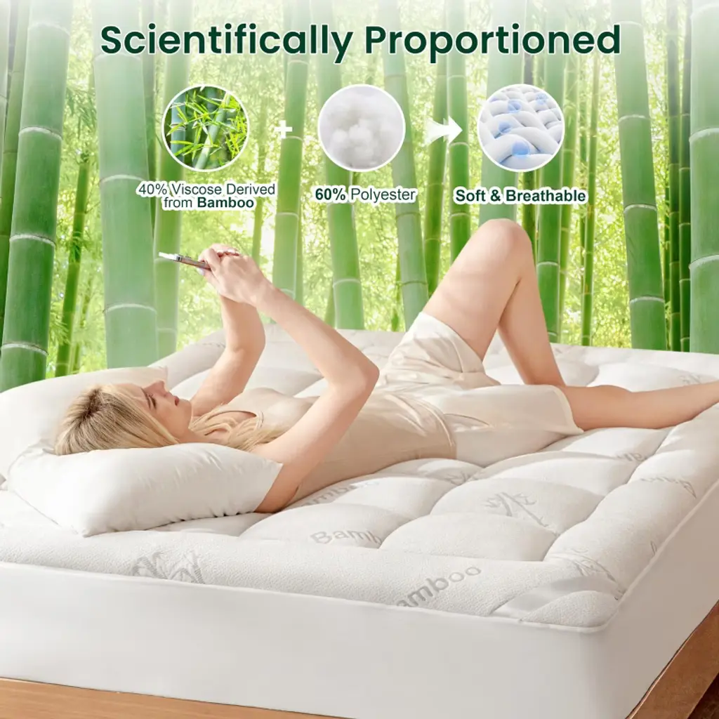 Upgrade your sleep with this luxurious mattress topper. Made of 40% rayon derived from bamboo and 60% polyester, it combines breathability with softness. The 3D and 7D microfiber filling offers extra resilience, keeping you cool and sweat - free. The mattress protector is easy to clean; simply toss it in the washing machine at low temperature and tumble dry on low. The stretchable knitted skirt with a 360° all - around wrapping design is suitable for a wide range of mattresses, allowing you to move around freely at night. The topper provides optimal thickness, balancing softness and cushioning to support your back. Before use, leave it for a few hours or put it in a dryer for a fluffier feel. Whether you're relaxing at home or having a good night's sleep, this mattress topper will bring you a comfortable and refreshing experience. If you have any questions, our customer service is ready to assist you within 24 hours.