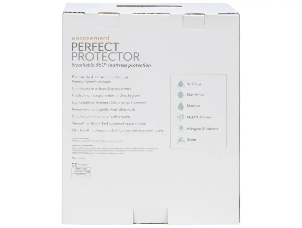 Encasement Perfect Protector is breathable 360-degree mattress protection. This 6-sided encasement is expertly designed to surround your mattress with a locking, zippered barrier against moisture, allergens, bed bugs, dust mites, mold, mildew, and stains. The best protection for mattresses measuring up to 12" in height for the ultimate clean, breathable, sleep experience.