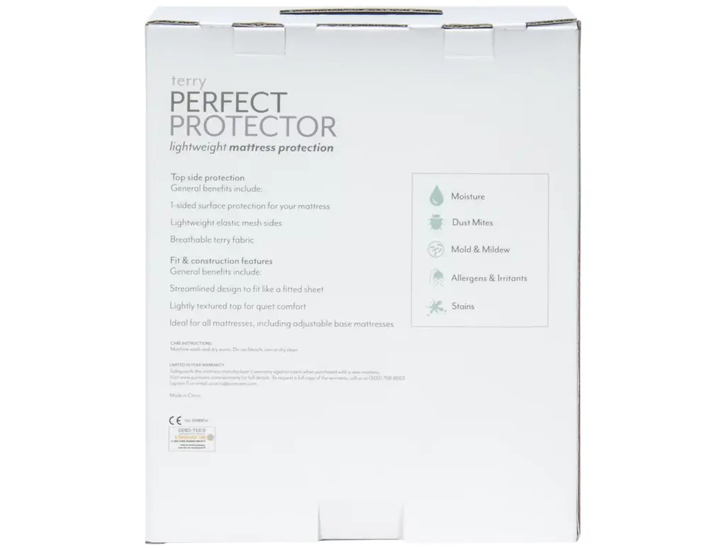 Terry Perfect Protector provides a comfortable and reasonably priced solution to protecting your mattress. Every mattress needs protection from allergens, irritants, liquids, and stains. Protection a typical mattress pad may not provide. This breathable protector ensures the top of your mattress remains clean and healthy and offers surface dust mite and allergen resistance for a better night’s sleep.