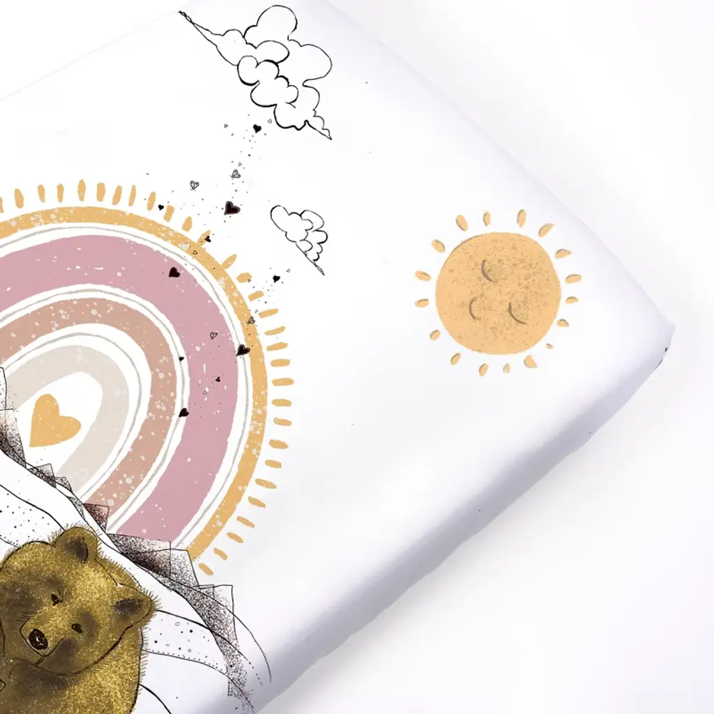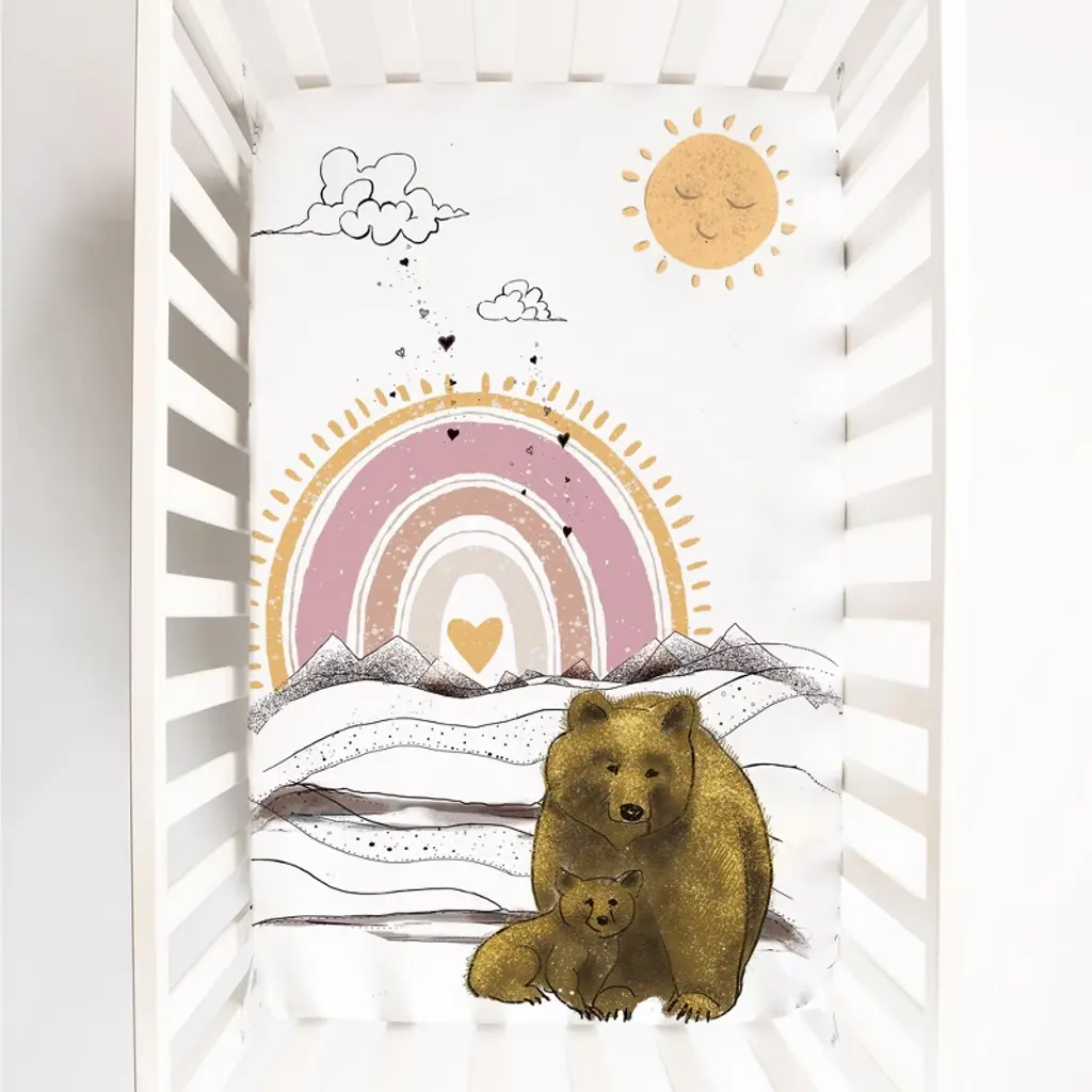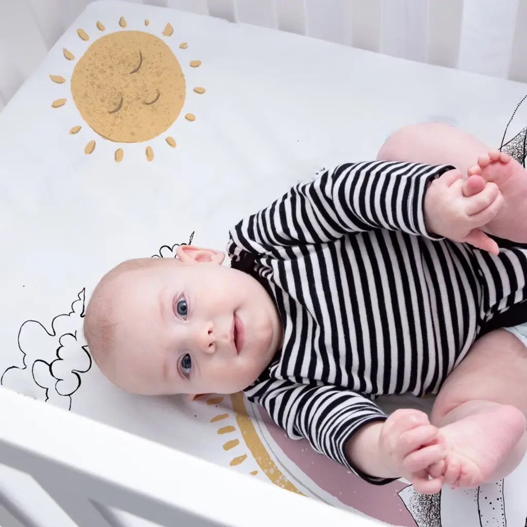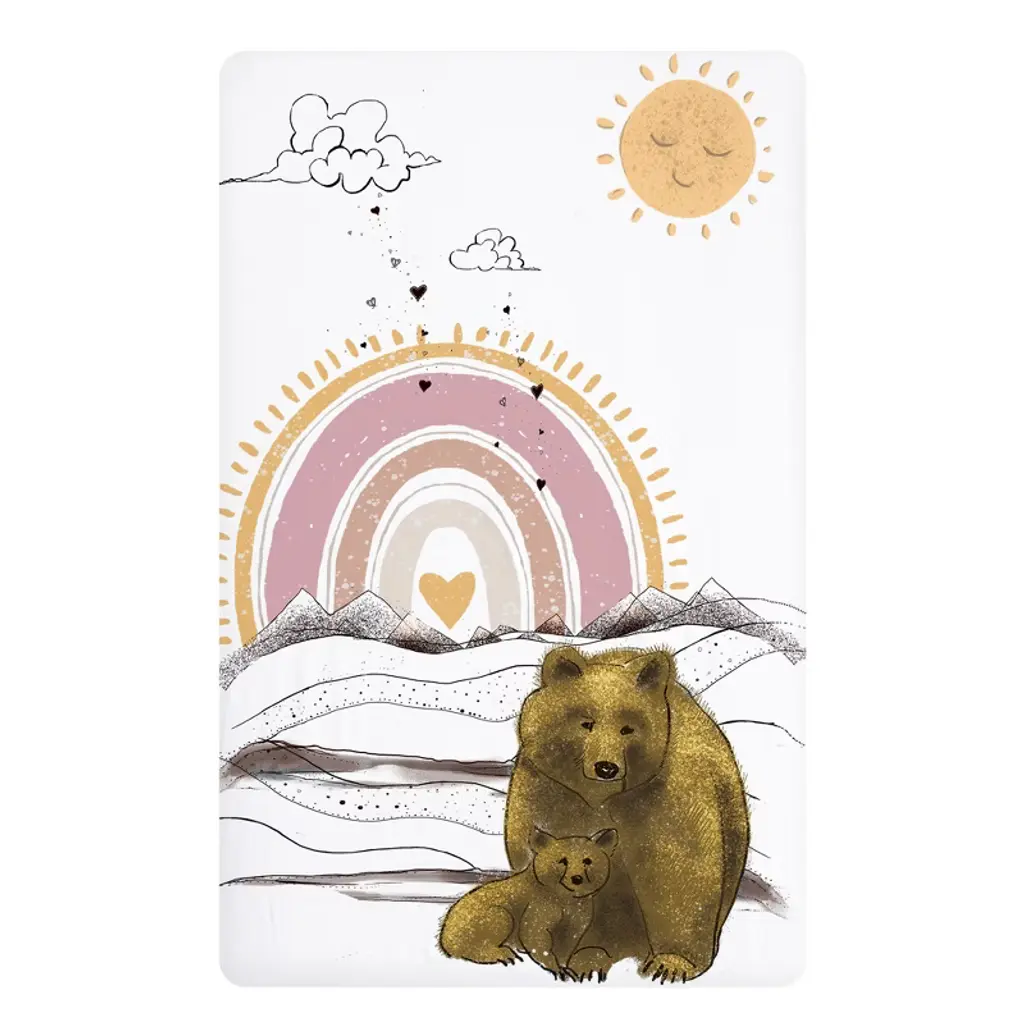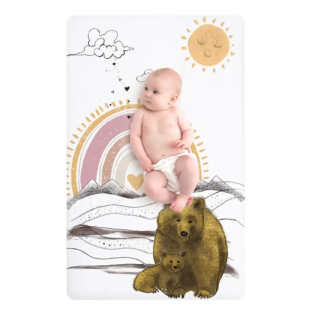A Mini Crib Sheet You’ll Love to the Moon & Back Designed by parents, the super soft JumpOff Jo Mama Bear Blue Mini Crib Sheet is lovingly made from 100% cotton to be gentle on your baby’s skin. The Mini Crib Sheet fits mini crib mattresses and standard sized playards, featuring extra-deep corners for the most secure fit. Available in an original design, the Mini Crib Sheet illustrates your love for your little one all the way to the moon and back. The hues of blue, black, and white will fit effortlessly into any bedroom. Fabric Care Details ● 100% cotton ● Machine wash cold with like colors ● Tumble dry low ● Cool iron if needed
