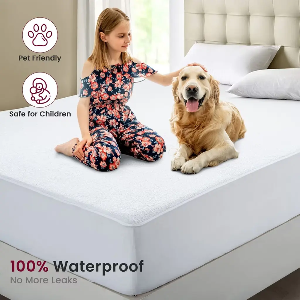 Lux Decor brings an amazing choice for protection your mattress against liquids and stains. Protect your mattress with our Terry Top Mattress Protector, expertly crafted to defend against spills, stains, and allergens. Made from premium terry fabric (100% polyester) with TPU membrane which provides a comfortable and breathable barrier, extending the life of your mattress and ensuring a restful night's sleep. Our mattress protector is 100% waterproof and locks the liquid in (no more leaks). Due to its breathability its pet friendly and safe for children as well. Choose this terry top mattress protector as it is hypoallergenic, noiseless, waterproof liquid membrane and up to 16'' deep pocket with 360 degree elastic all around. Available in 6 size Twin, Twin XL, Full, Queen, King and Cal King.